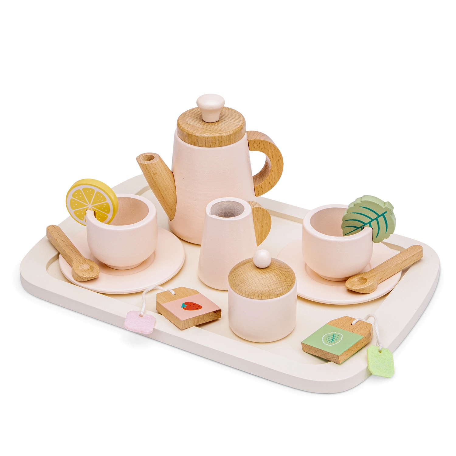 Pozovite plišance i prijatelje na stilsko čajno druženje s prekrasnim drvenim setom za djecu od 2 godine. Set sadrži čajnik s poklopcem, 2 šalice s tanjurićima, vrč za mlijeko, posudicu za šećer, žličice, vrećice čaja, krišku limuna, listić mente i prostrani poslužavnik. Potiče finu motoriku, maštu i društvenu igru, a zahvaljujući prirodnom drvu i nježnim bojama lijepo će se uklopiti u dječju sobu.