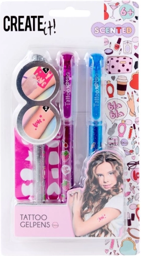 Otkrij svoju kreativnost s mirisnim gel olovkama za tetoviranje CREATE IT!. Set od tri sjajne olovke i šablona omogućuje ti stvaranje privremenih tetovaža s voćnim mirisom jabuke i borovnice. Tinta se lako ispire vodom, proizvodi su dermatološki testirani, bez parabena i nisu testirani na životinjama – sigurno za djecu od 6 do 14 godina.
