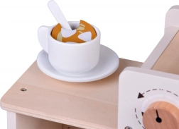 Okretni gumbi, otisnute ikone i kolba stvaraju dojam prave pripreme kave. Djeca mogu ubacivati drvene kapsule i “podesiti” idealan napitak.