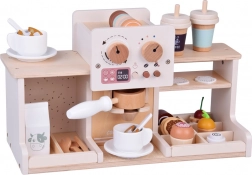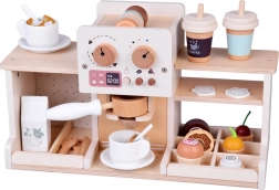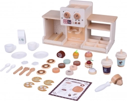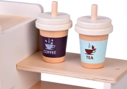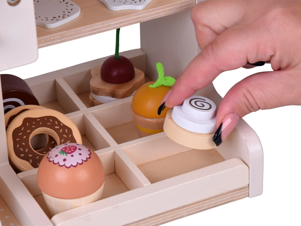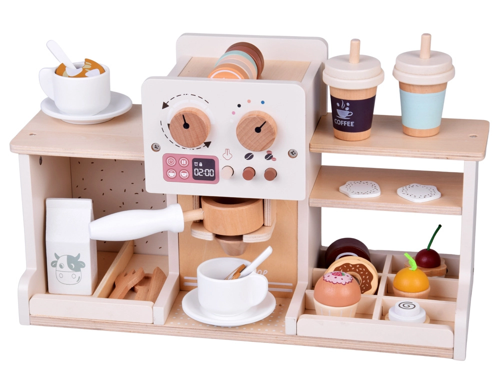 Otkrijte čaroliju barističkog svijeta s drvenom kavanom koja izgleda i funkcionira kao prava. Djeca mogu “podešavati” jačinu kave pomoću okretnih gumba, umetati kolbu/portafilter, birati kapsule s kavom ili čajem, pjeniti “mlijeko” i posluživati deserte na tanjurićima. Čvrsta drvena konstrukcija s sigurnim bojama i nježnom pastelnom paletom osigurava dug vijek i lijep izgled u dječjoj sobi.