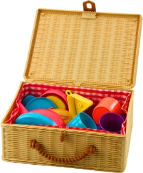 Presladak dječji set za čaj u prijenosnoj košarici donosi čak 23 šarena dijela za kreativnu igru piknika, kavane ili čajanke. Lagani i sigurni materijali, zaobljeni rubovi te praktično spremanje u pletenu košaricu s poklopcem i ručkom osiguravaju lako prenošenje i odlaganje. Poticanje mašte, suradnje i učenja boja.