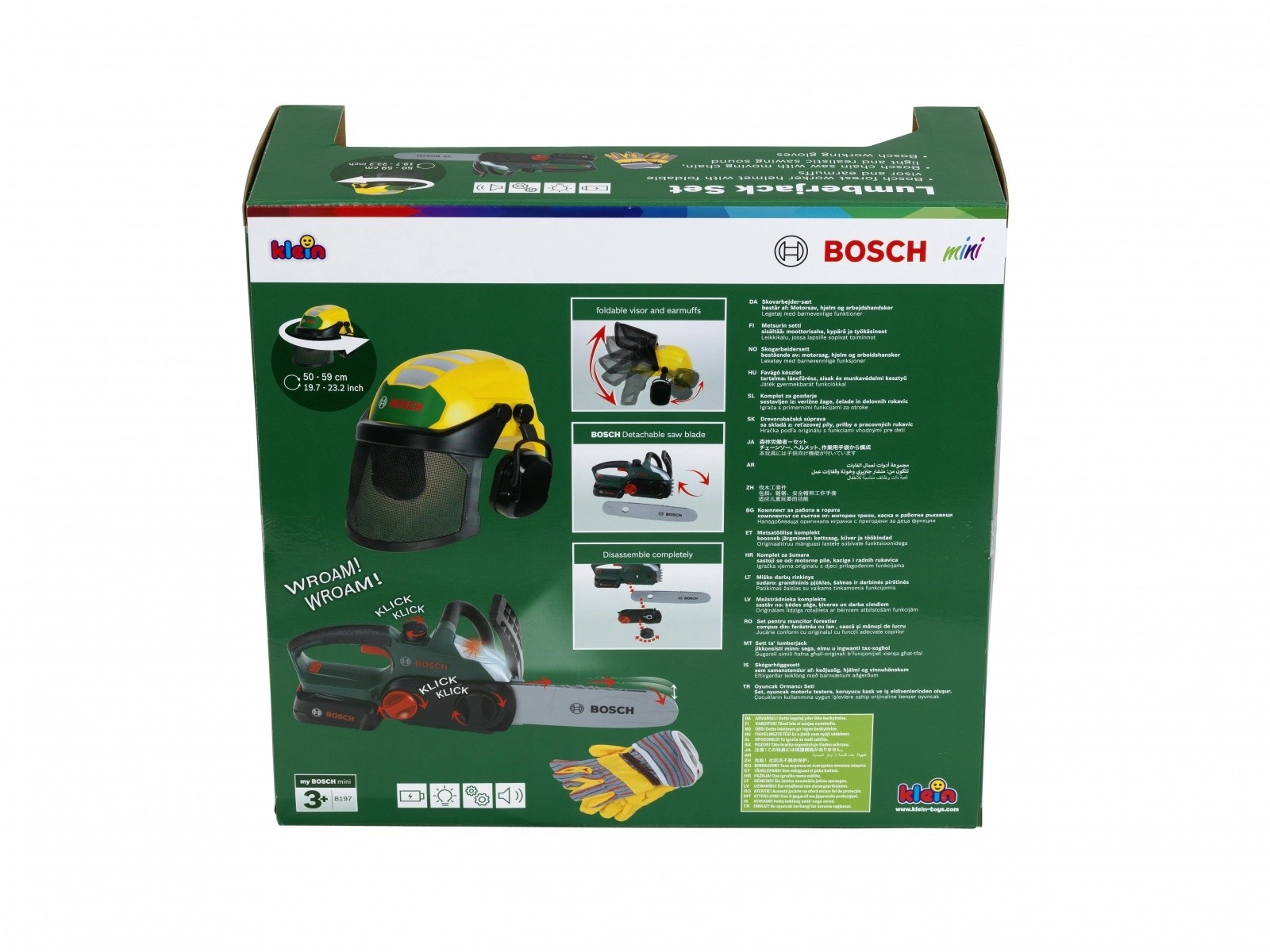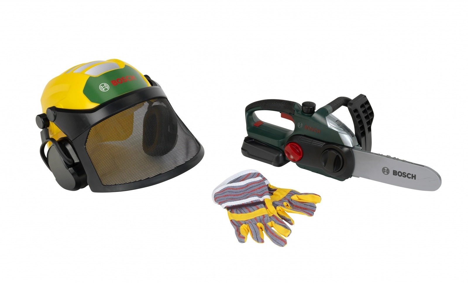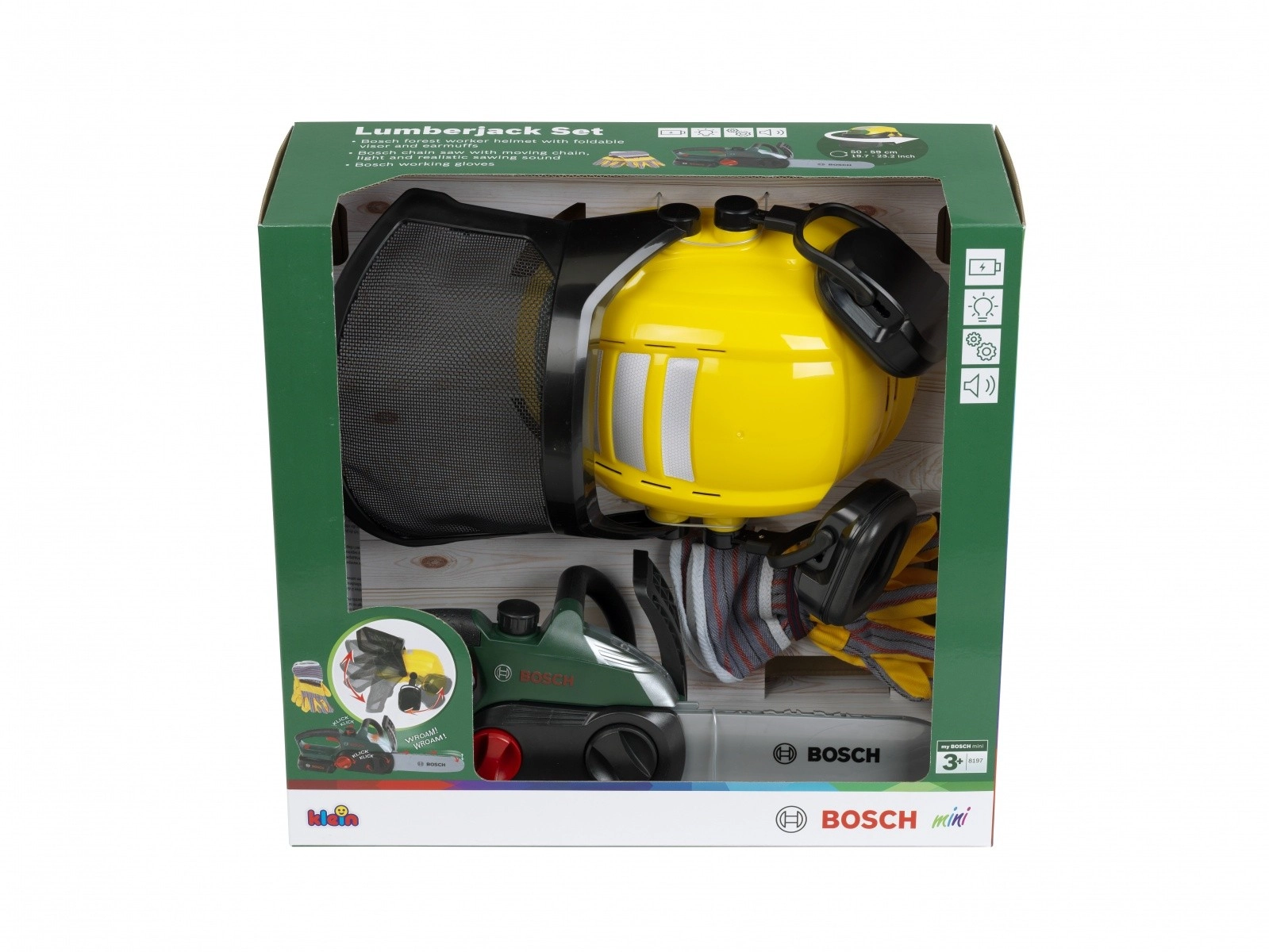 Dječji set drvosječe BOSCH osmišljen je za sigurnu i poticajnu igru. Elektronična motorna pila nakon postavljanja vodilice proizvodi autentičan zvuk rezanja i prateće bljeskajuće svjetlo, koje simulira rad pravog alata. Podesiva kaciga sa štitnikom i integriranim “slušalicama” pojačava dojam realnosti i uči djecu osnovama sigurnosti.