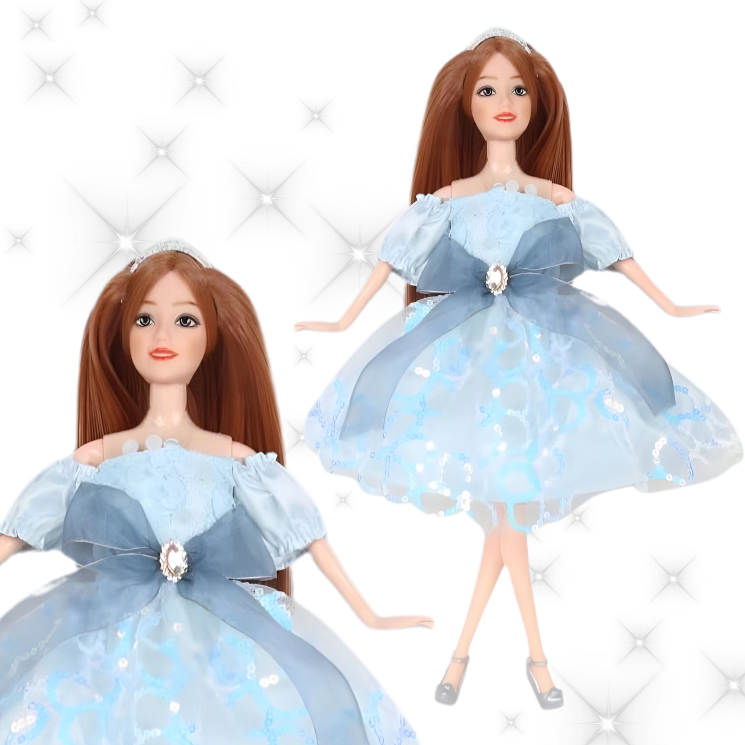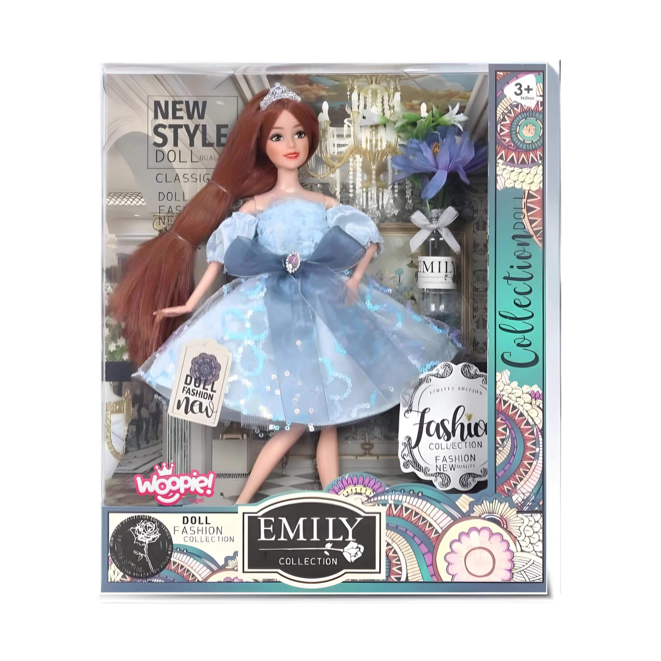 Otkrijte čaroliju mode s lutkom Emi brenda Woopie Royal. Nebeskoplava, blistava haljina s nježnim tilom, mašnom i kraljevskom krunom naglašava njezin elegantan izgled. Pokretne ruke i noge omogućuju različite poze i kreativno stiliziranje, zahvaljujući čemu se svaka igra pretvara u čarobnu avanturu.