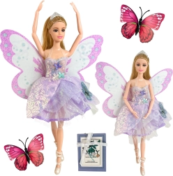 Otkrijte svijet mašte s lutkom vilom Emi, koja očarava sjajnim leptirićim krilima, ljubičastom pastelnom haljinom i pokretnim udovima. Elegantna kruna, stilske cipelice i kvalitetna izrada od sigurnih materijala pretvaraju svaku igru u čarobnu priču – sjajna ideja za poklon.