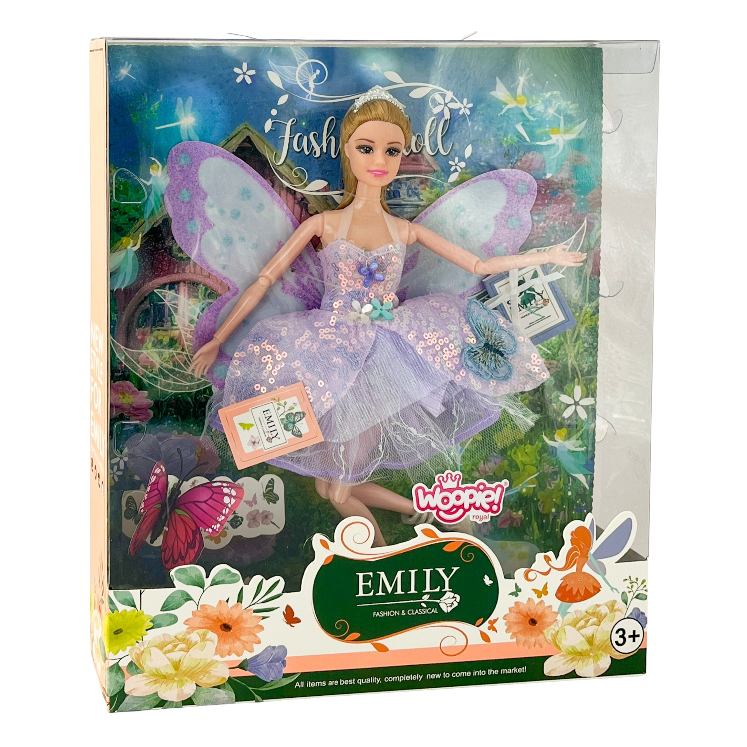Lutka Woopie Royal vila Emi stvorena je za male ljubiteljice bajki. Nježni pastelni tonovi ljubičaste, sjajni ukrasi i lagana tila suknja stvaraju očaravajući izgled koji će se istaknuti u svakoj dječjoj sobi. Zahvaljujući pokretnim udovima i odvojivim leptirićim krilima djeca mogu stvarati vlastite čarobne scene i priče.