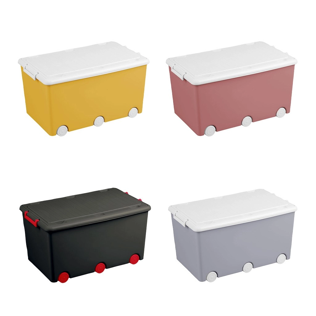 Napravite red u dječjoj sobi lako i brzo s ovom prostranom kutijom za igračke na kotačićima. Nudi kapacitet 60 litara, dimenzije 57 × 36 × 29 cm i 6 kotačića za lako premještanje. Zahvaljujući bočnom zatvaranju s 2 drukera sigurno pohranjuje igračke, knjige i sitnice. Kutija je izrađena od kvalitetne atestirane plastike i može se slagati radi uštede prostora.