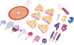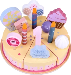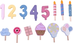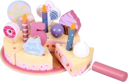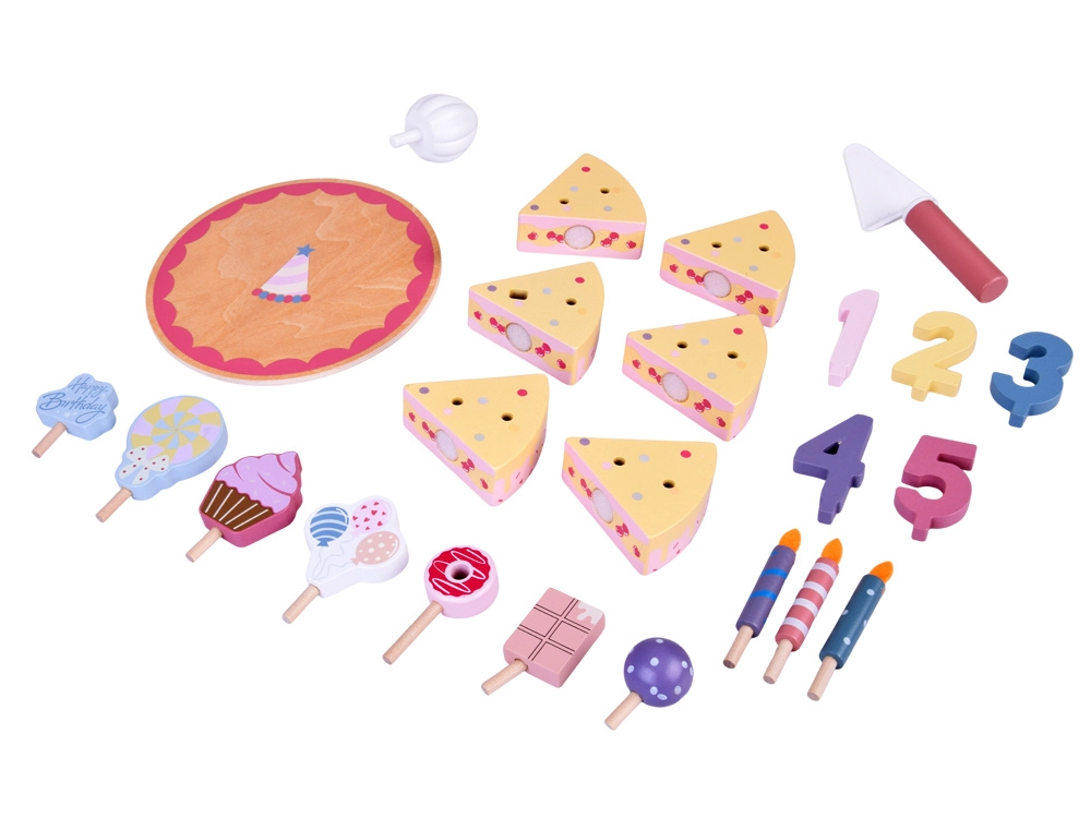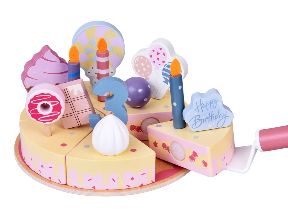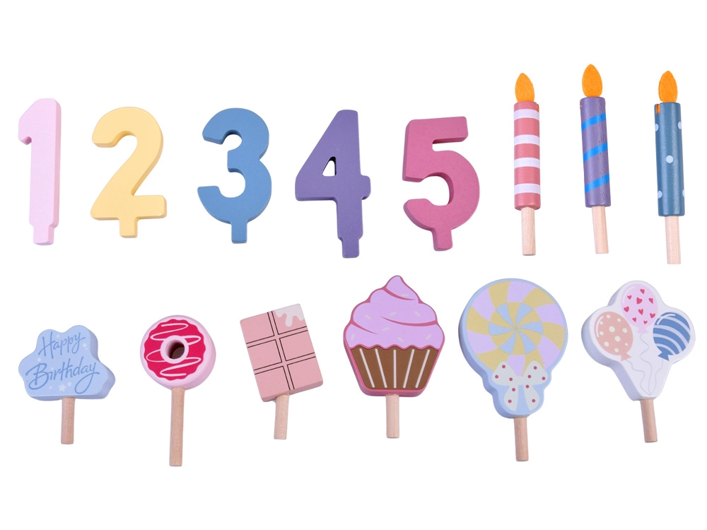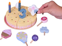 Napravite vlastitu rođendansku proslavu! Drvena torta sastoji se od 6 komada koji se mogu „odrezati” i ponovno spojiti te ukrasiti zamjenjivim svjećicama, brojkama i slasticama. Set je idealan za zajedničku igru, učenje boja, brojanje i vježbanje pristojnog posluživanja.