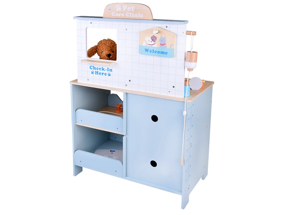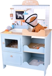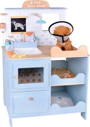 Dječja drvena veterinarska klinika nudi sve što malim ljubiteljima životinja treba za brigu o svojim plišanim pacijentima. Robusna drvena konstrukcija s zaobljenim rubovima i netoksičnim bojama osigurava sigurnu igru, dok promišljeni elementi – sudoper, police, prozorčić za prijem, ploča i spremišne pregrade – čine igru autentičnom i preglednom.