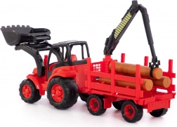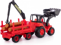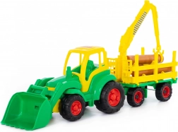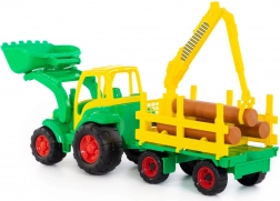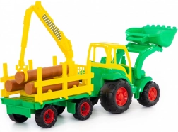Ovaj šareni traktor s velikim kotačima i prikolicom za trupce idealan je za kreativnu igru kod kuće i na igralištu. Djeca mogu pomoću pomične prednje lopate skupljati materijal te s dizalicom s kliještima na prikolici prebacivati i utovarivati drvene trupce. Izdržljiva plastična izrada osigurava dug vijek trajanja i sigurno igranje.