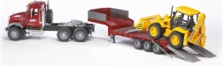 Ovaj detaljni set kombinira robusni tegljač MACK s niskopodnom poluprikolicom i svestrani utovarivač JCB 4CX. Zahvaljujući preciznom mjerilu 1:16 i funkcionalnim elementima, djeca uživaju u autentičnoj igri – od utovara do prijevoza građevinskih strojeva. Modeli su namijenjeni intenzivnoj igri, a ujedno se ističu i kao atraktivan izložbeni primjerak.