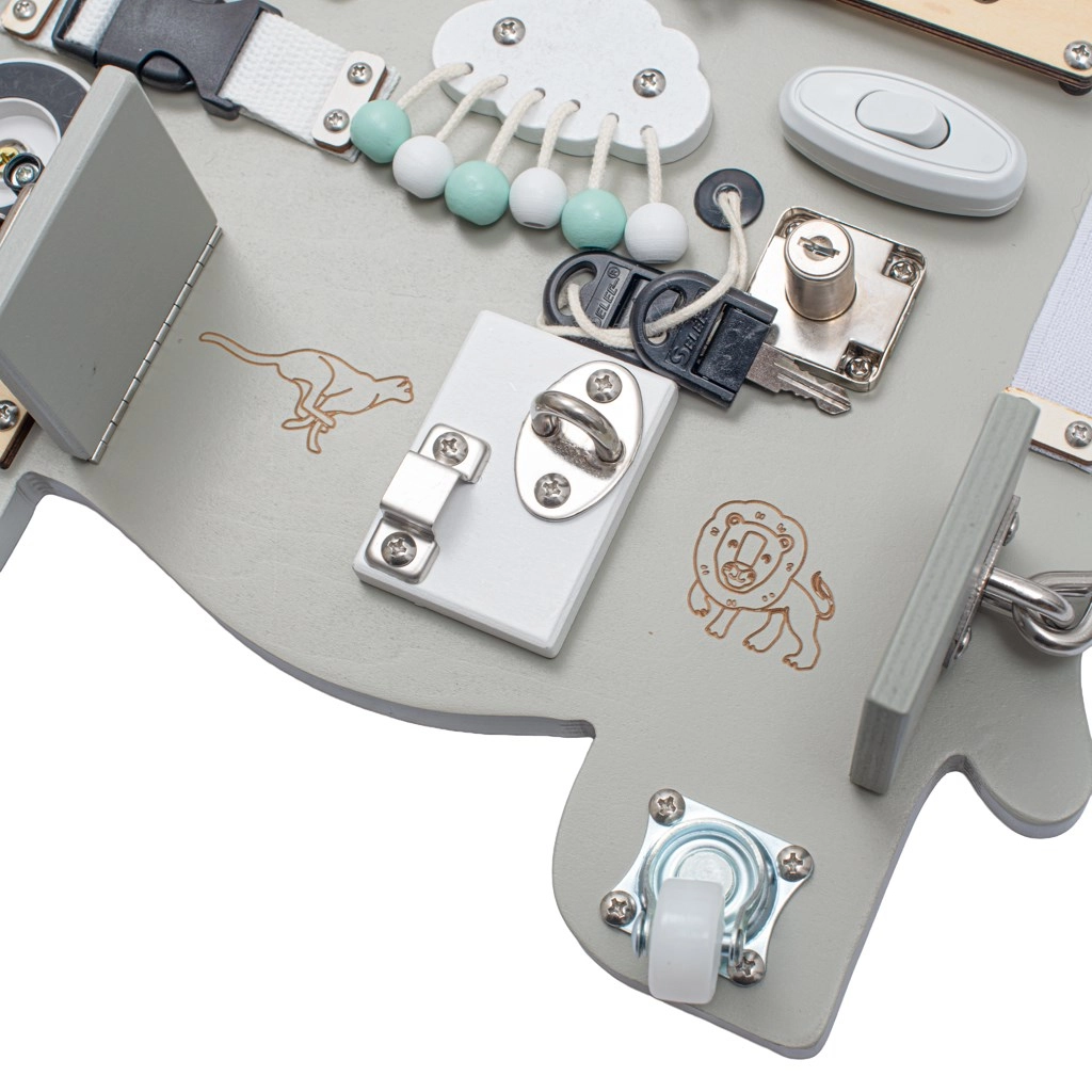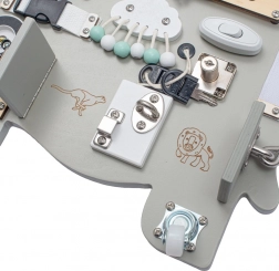 Ova edukativna Montessori aktivna ploča donosi djeci stvarne poticaje iz svakodnevnog života i motivira ih na samostalno istraživanje. Elegantni dizajn sa slonom savršeno će se uklopiti u svaki interijer, a zahvaljujući čvrstom drvu izdržat će i intenzivno korištenje.