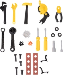 Ovaj promišljeni set za male majstore nudi čak tri načina igre: stacionarnu radionicu s panelom za alat, gurajuća kolica za prevoženje opreme i tačke za dodatne varijante igre. Bogata oprema, uključujući pilu s pomičnim listom, ključeve, vijke i pločice, poziva na zavrtanje, sastavljanje i otkrivanje principa konstrukcije.