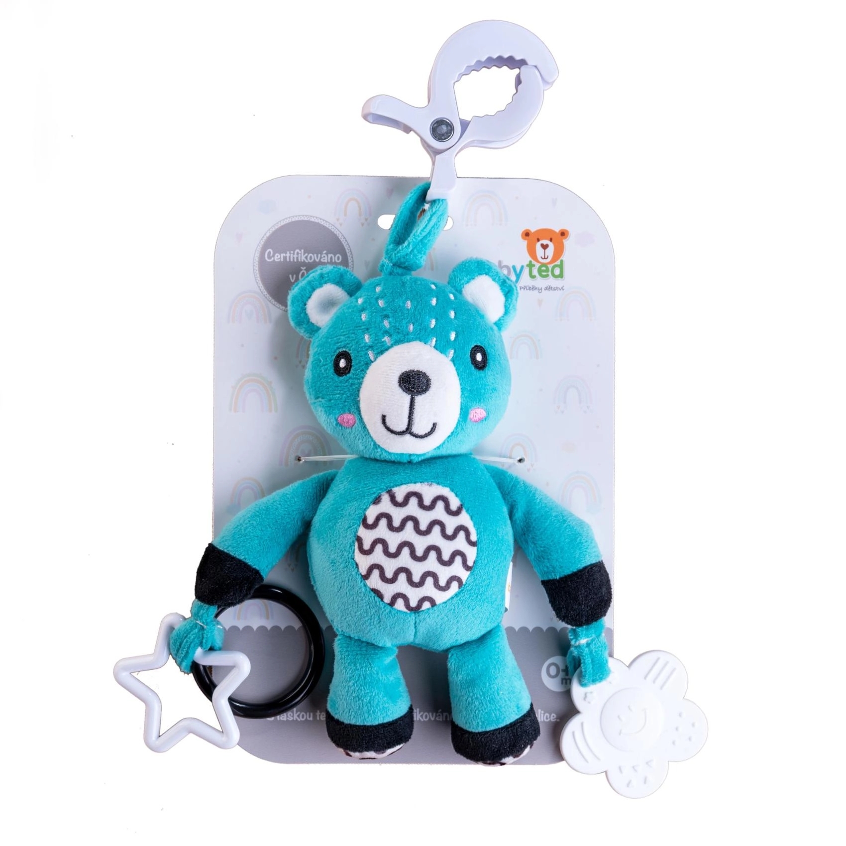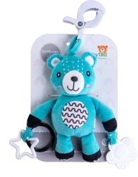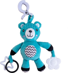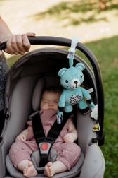 Ovaj plišani medvjedić dizajniran je za najmlađu djecu od 0 mjeseci. Zahvaljujući univerzalnom klipu lako ga pričvrstite na kolica, krevetić, autosjedalicu ili baby gym. Mekana površina poziva na maženje, dok nježna zvečka potiče slušnu percepciju i privlači bebinu pažnju.