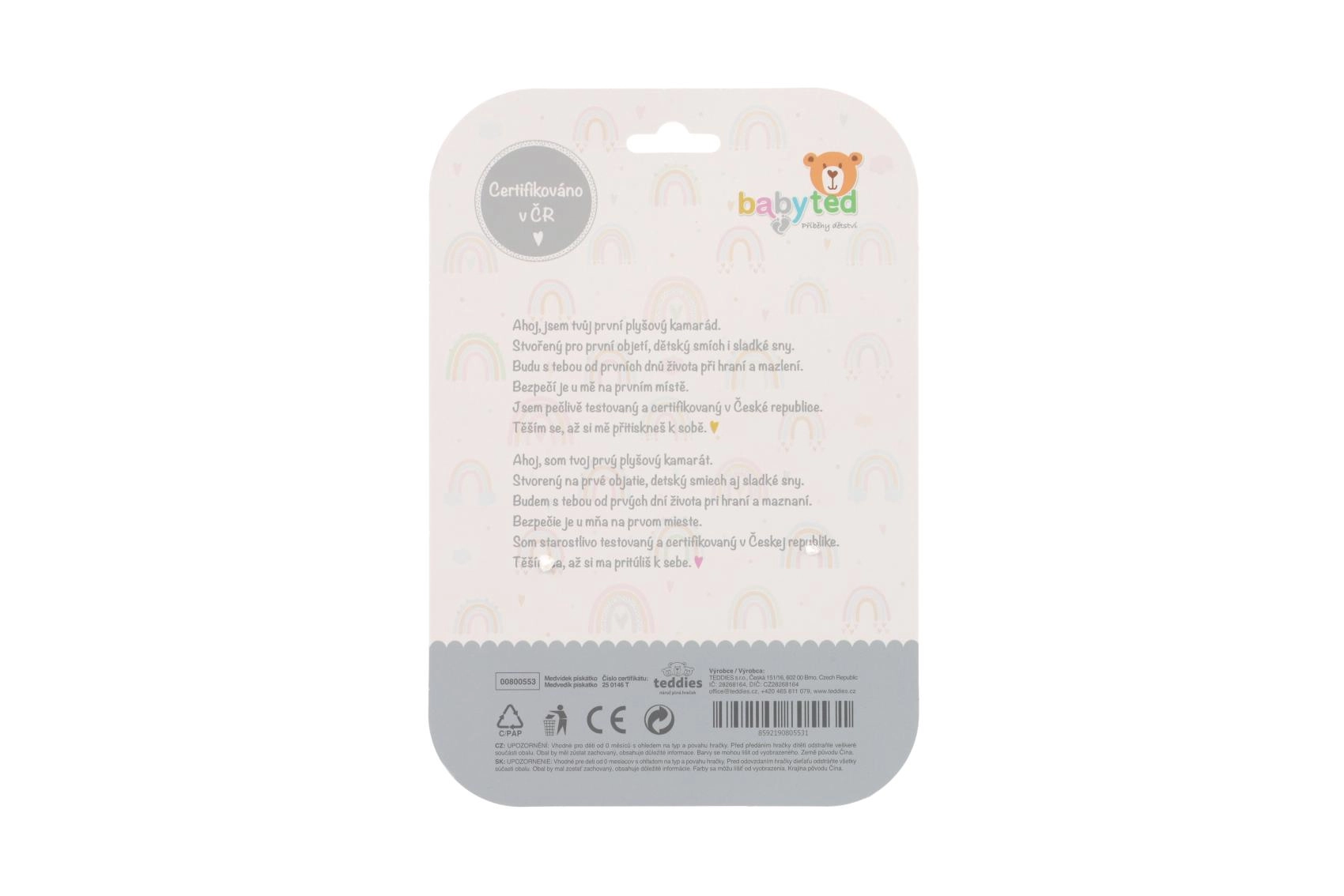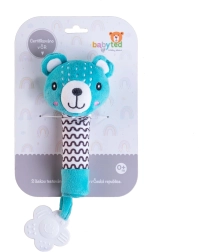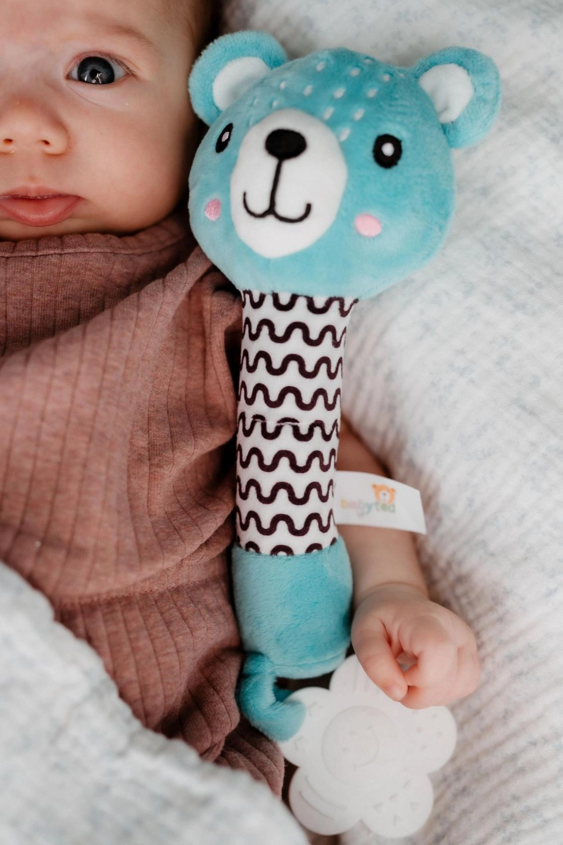 Preslatka plišana zviždaljka s medvjedićem od BABYTED idealna je prva igračka za bebe od 0 mj+. Zahvaljujući dugom mekom držaču odlično pristaje u male ručice, pri stisku nježno zviždi i potiče slušnu percepciju. Na kraju se nalazi mekana grickalica u obliku cvjetića koja pruža olakšanje osjetljivim desnima. Mekani, sigurni pliš i kontrastni uzorci podržavaju vid i senzorički razvoj. Igračka je certificirana u RH i zadovoljava stroge sigurnosne norme.
