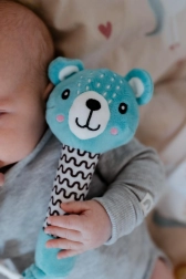 Nakon stiska igračka ispušta umirujući zvižduk koji prirodno privlači pažnju bebe i potiče razvoj slušne percepcije.