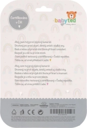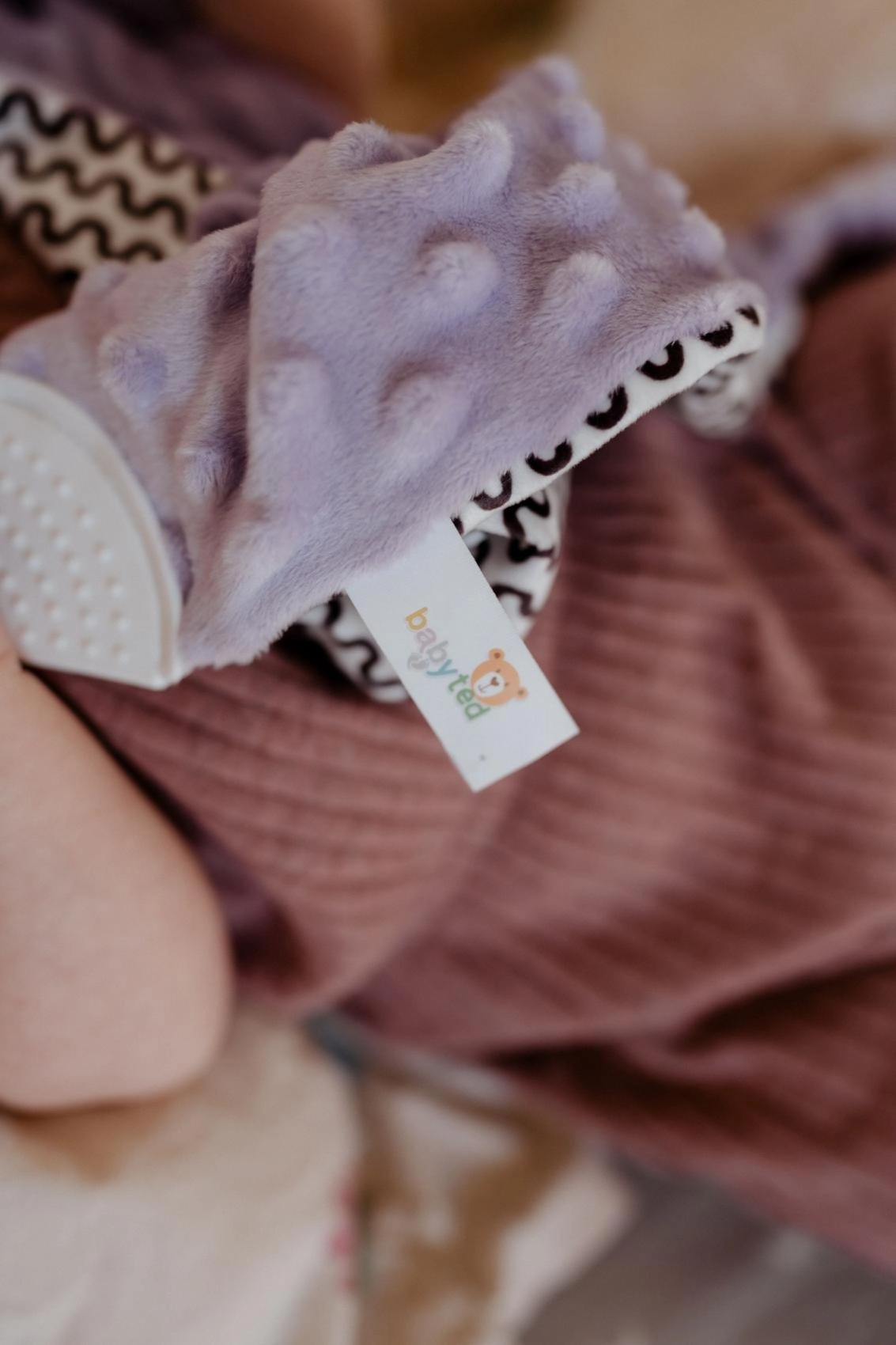 Unutra je skrivena nježna zvečka za razvoj sluha, u jednom kutu mekana silikonska grickalica za olakšanje bolnih desni, a na rubovima čvorići koji potiču finu motoriku. Praktična veličina 25 × 25 cm idealna je za krevetić, kolica i autosjedalicu.
