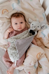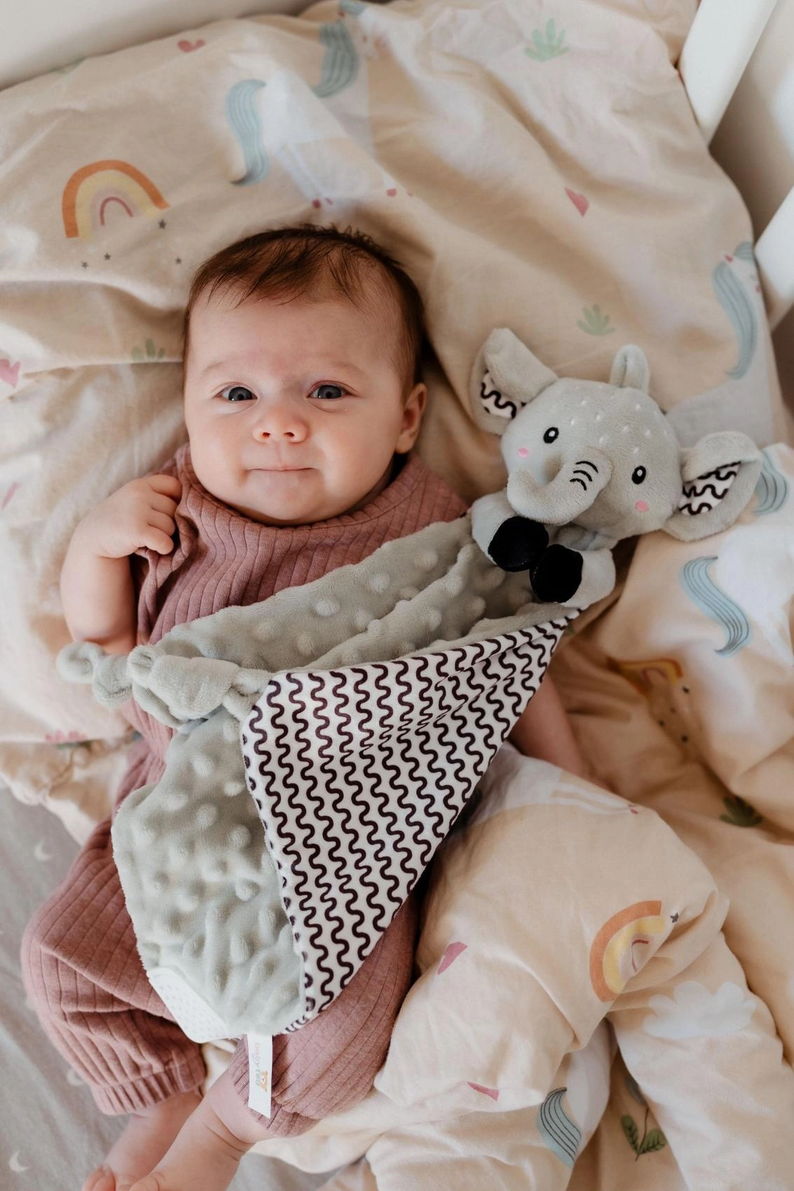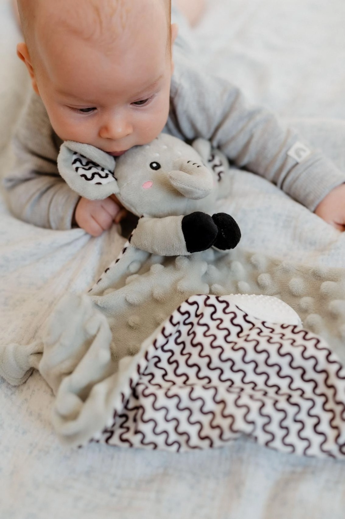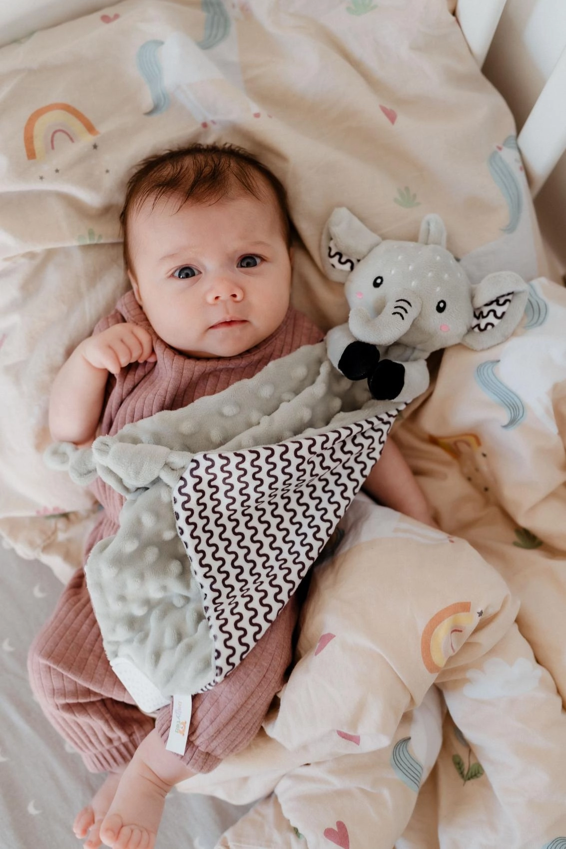 Mekani duduš u obliku slonića od BABYTED pruža bebi osjećaj sigurnosti i miran san. Plišani minky materijal s 3D točkicama mami na maženje, skrivena nježna zvečka potiče sluh, a meka silikonska grickalica olakšava nicanje zubića. Prikladno od rođenja, certificirano u RH.