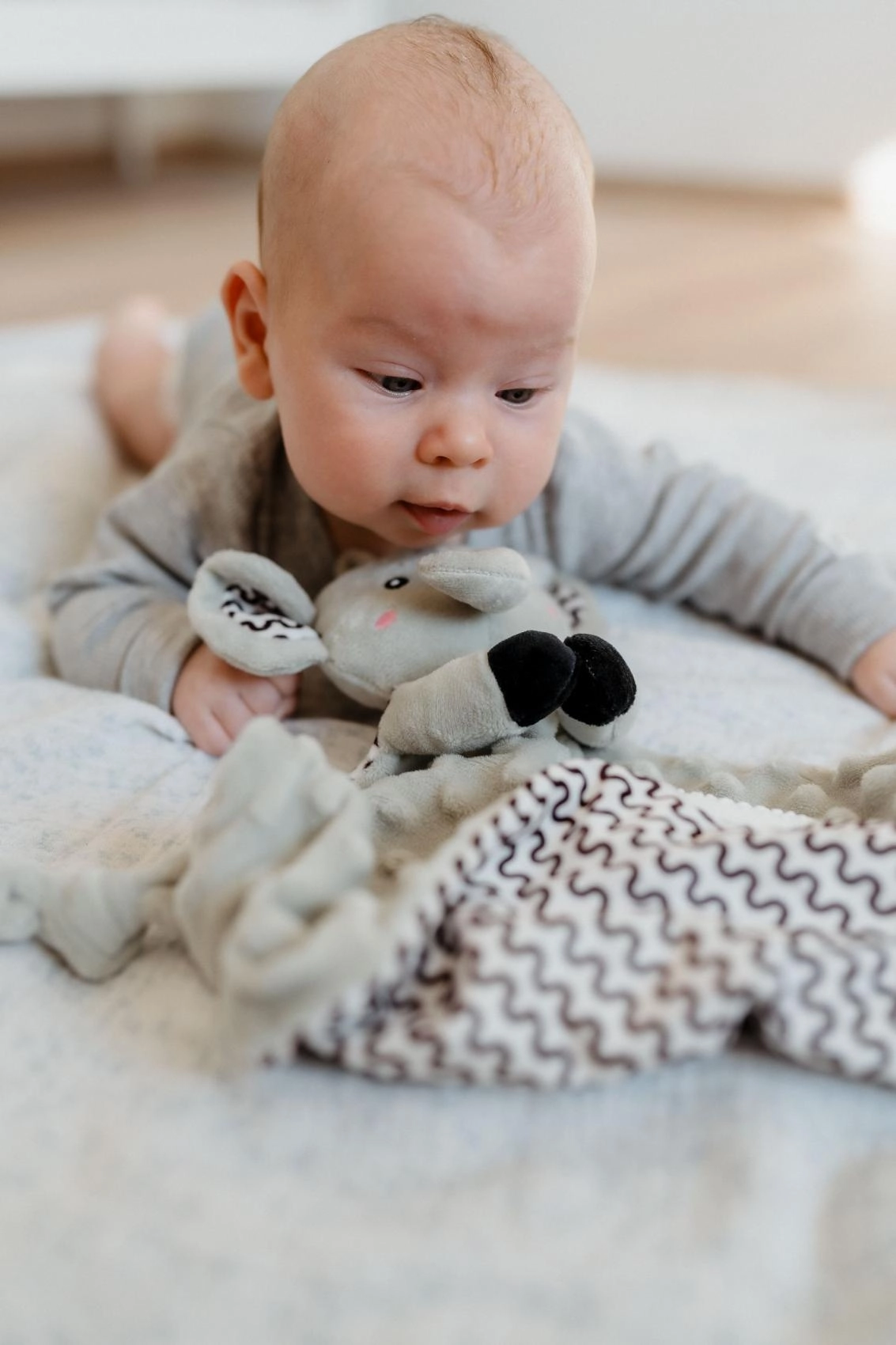 Ultra mekani materijal s reljefnim točkicama pruža bebi udobnost, sigurnost i nježnu senzoričku stimulaciju pri maženju i uspavljivanju.