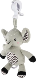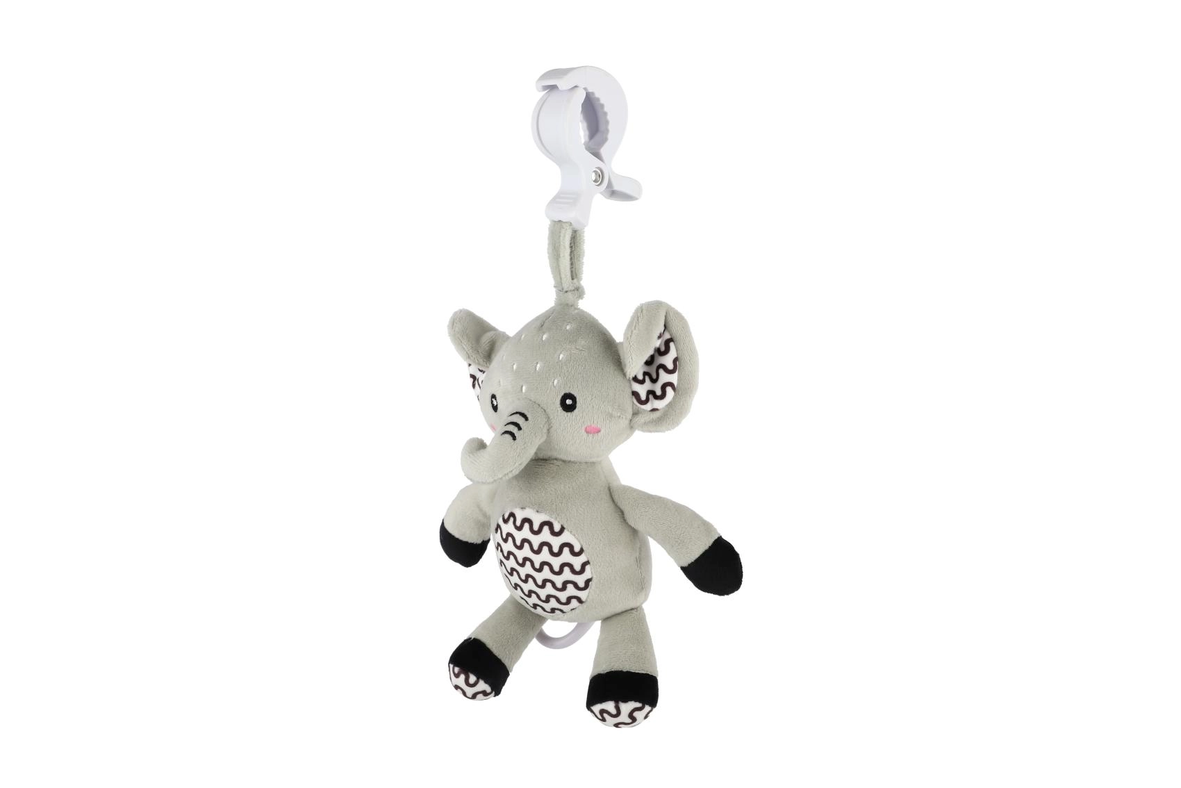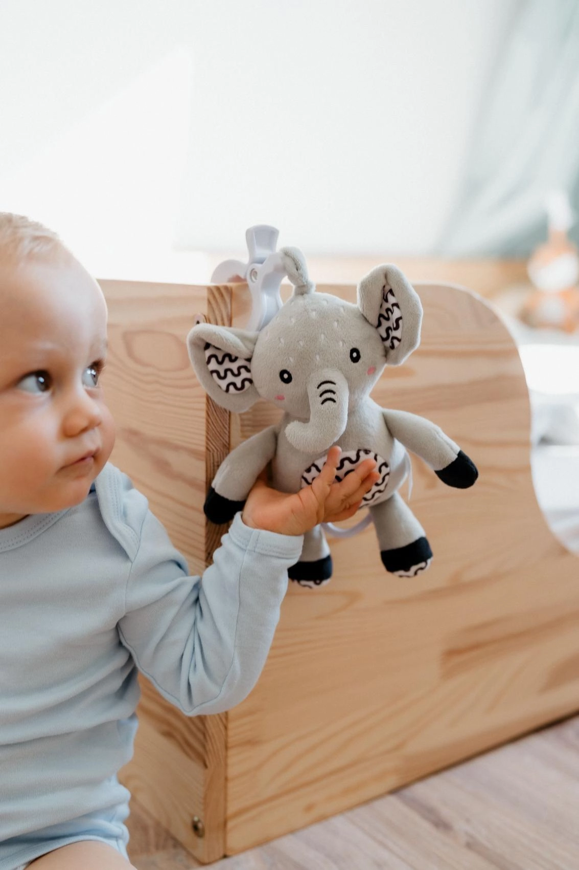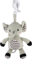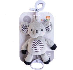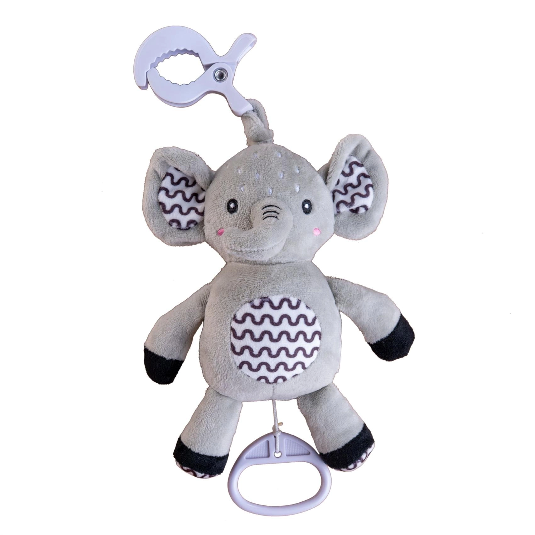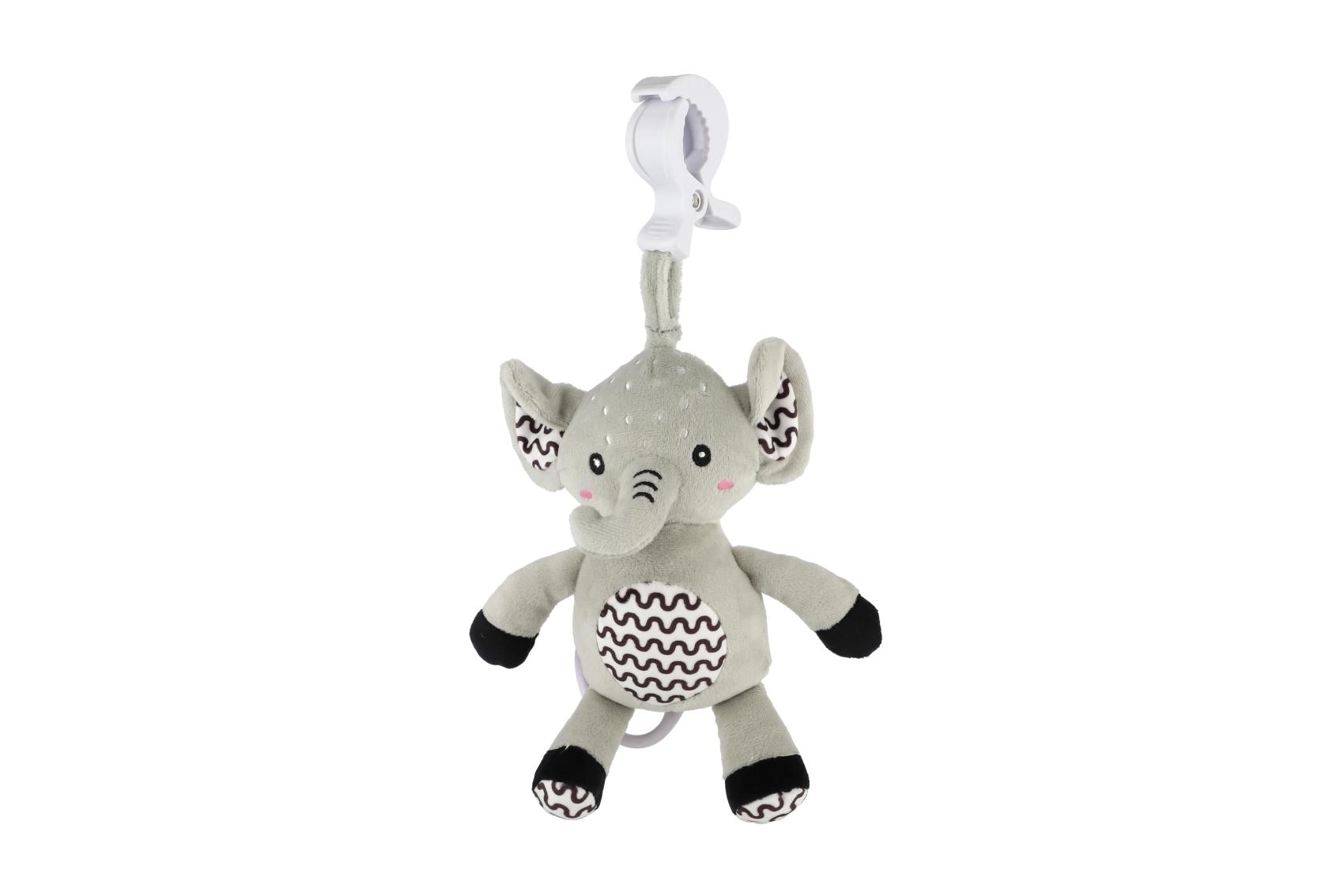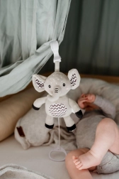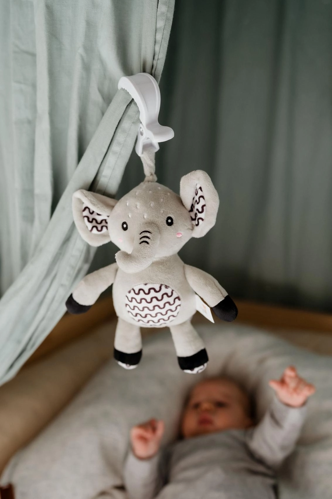 Slatka plišana slonica s navijajućom glazbenom kutijom umiruje bebu nježnom melodijom, a zahvaljujući praktičnoj kopči lako je pričvrstite na krevetić, kolica ili autosjedalicu. Mekani pliš ugodan je na dodir, a kontrastni uzorci na ušima i trbuščiću potiču vizualnu percepciju. Certifikacija u RH jamči sigurnost od 0 mjeseci.