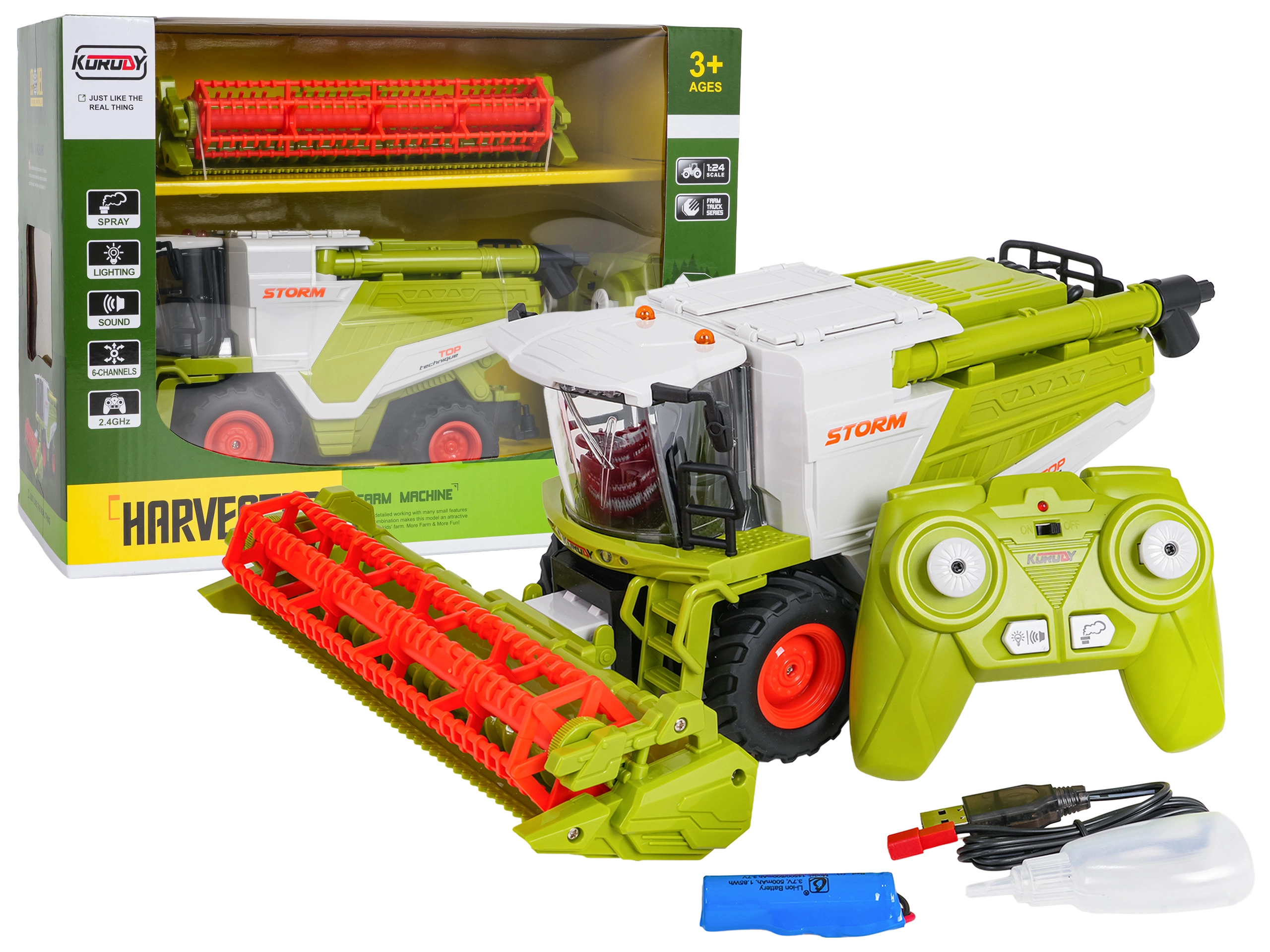 Realistični RC kombajn u mjerilu 1:24 oduševit će male farmere od 3 godine. Nudi vožnju u svim smjerovima, gumene gume s dobrom prianjivošću, rotirajući žetveni valjak, otvoriv spremnik za žito i LED osvjetljenje. Zahvaljujući dimnom efektu (vodena para) i realističnim zvukovima djeluje kao pravi stroj. Upravljanje je na 2,4 GHz, dostupna je mogućnost isključivanja svjetala i zvukova te automatsko uspavljivanje radi uštede baterije.
