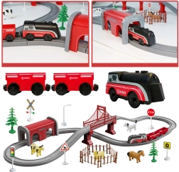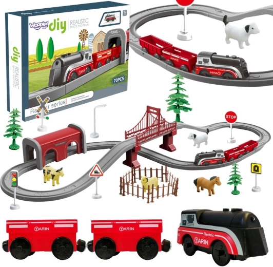 Dio seta je bogata oprema – figurice konja, psa, ovna i krave, stabla, ograde i prometna signalizacija. Djeca mogu slagati različite varijante pruga i razvijati prostorno razmišljanje, samostalnost i motoriku. Kvalitetna izrada i izrazite boje podupiru sigurnu i poticajnu igru.