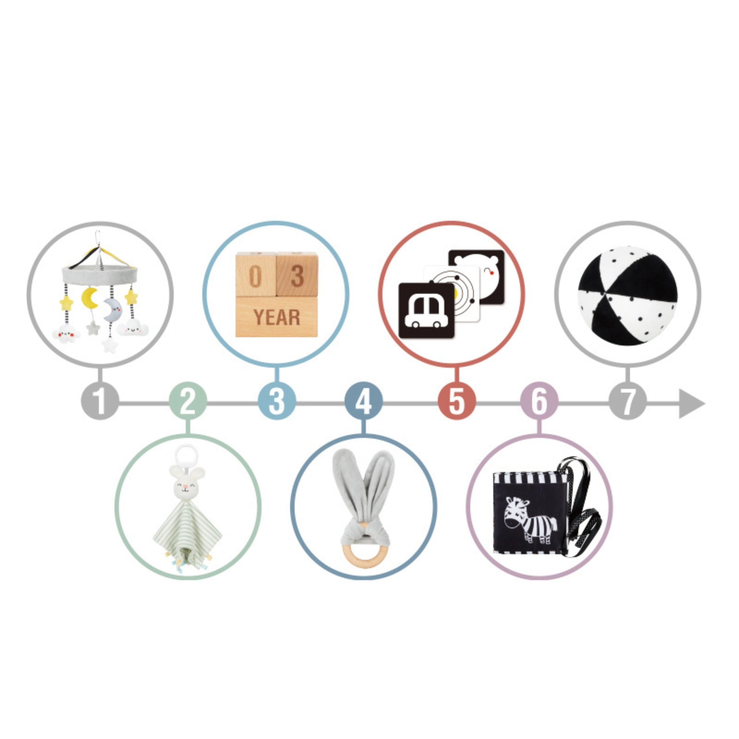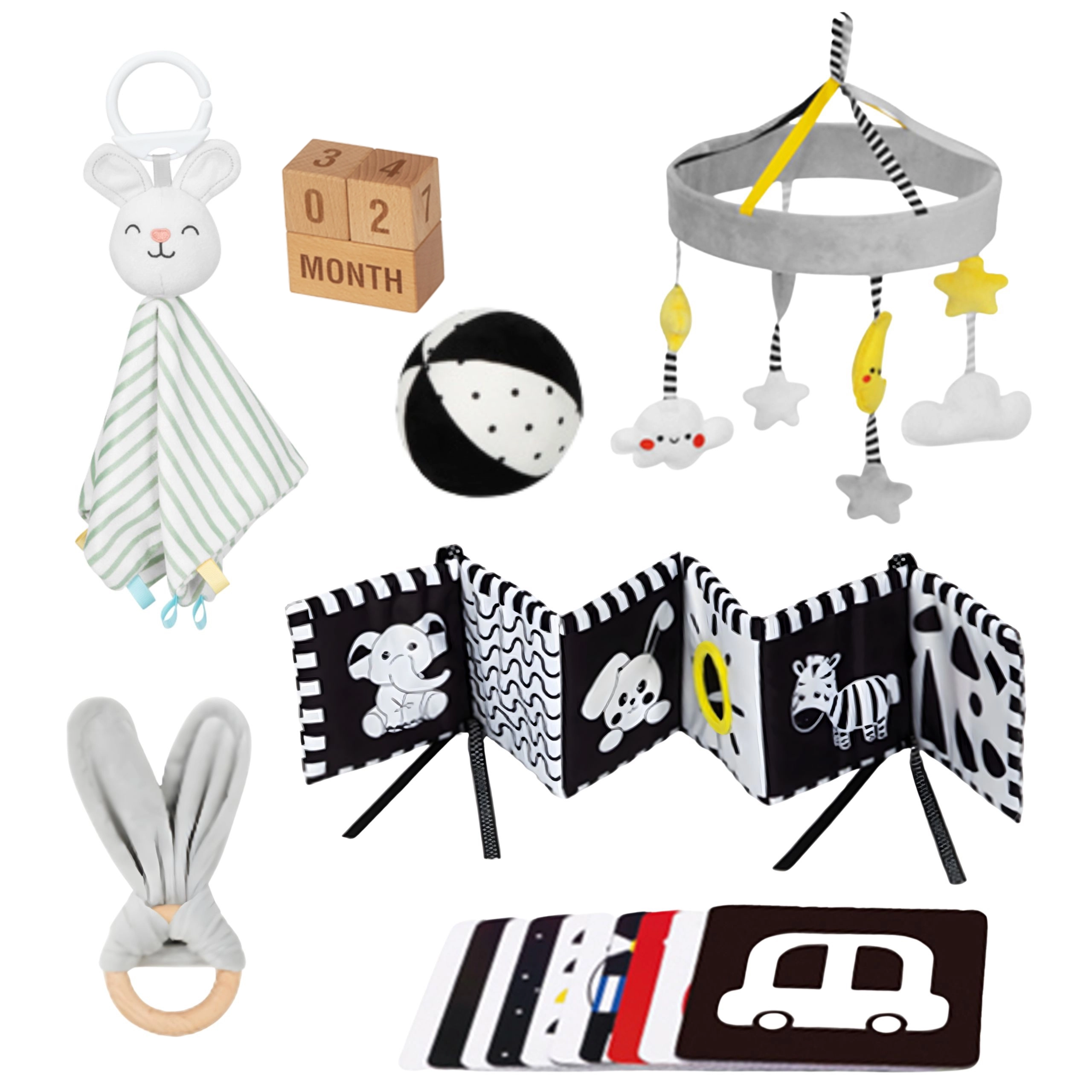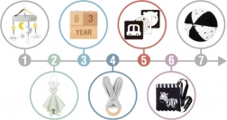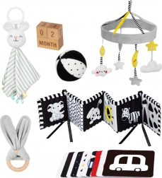 Ovaj promišljeni set nudi 6 didaktičkih pomagala i dodatke za bilježenje prekretnica. Visokokontrastni uzorci privlače bebinu pažnju i podupiru vizualni razvoj, a mekane teksture pozivaju na taktilno istraživanje. Lagana, sigurna i lako prihvatljiva izdanja potiču finu motoriku i prvo usmjereno igranje.