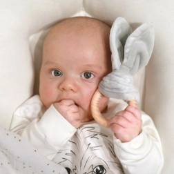 Drvena grickalica s tekstilnim “uškama” lako se drži i u najmanjim ručicama, pomaže pri nicanju zubića i podupire koordinaciju oko–ruka.