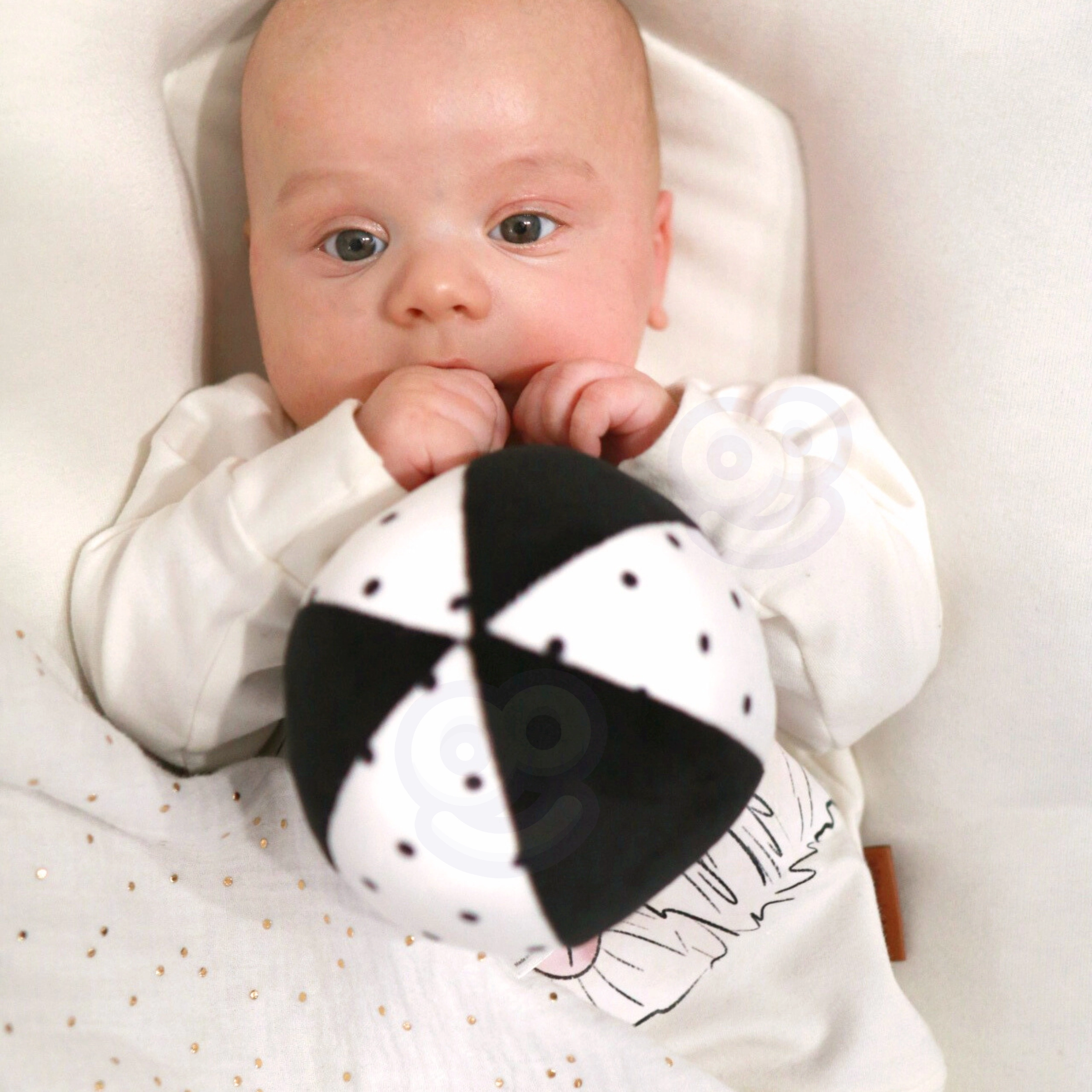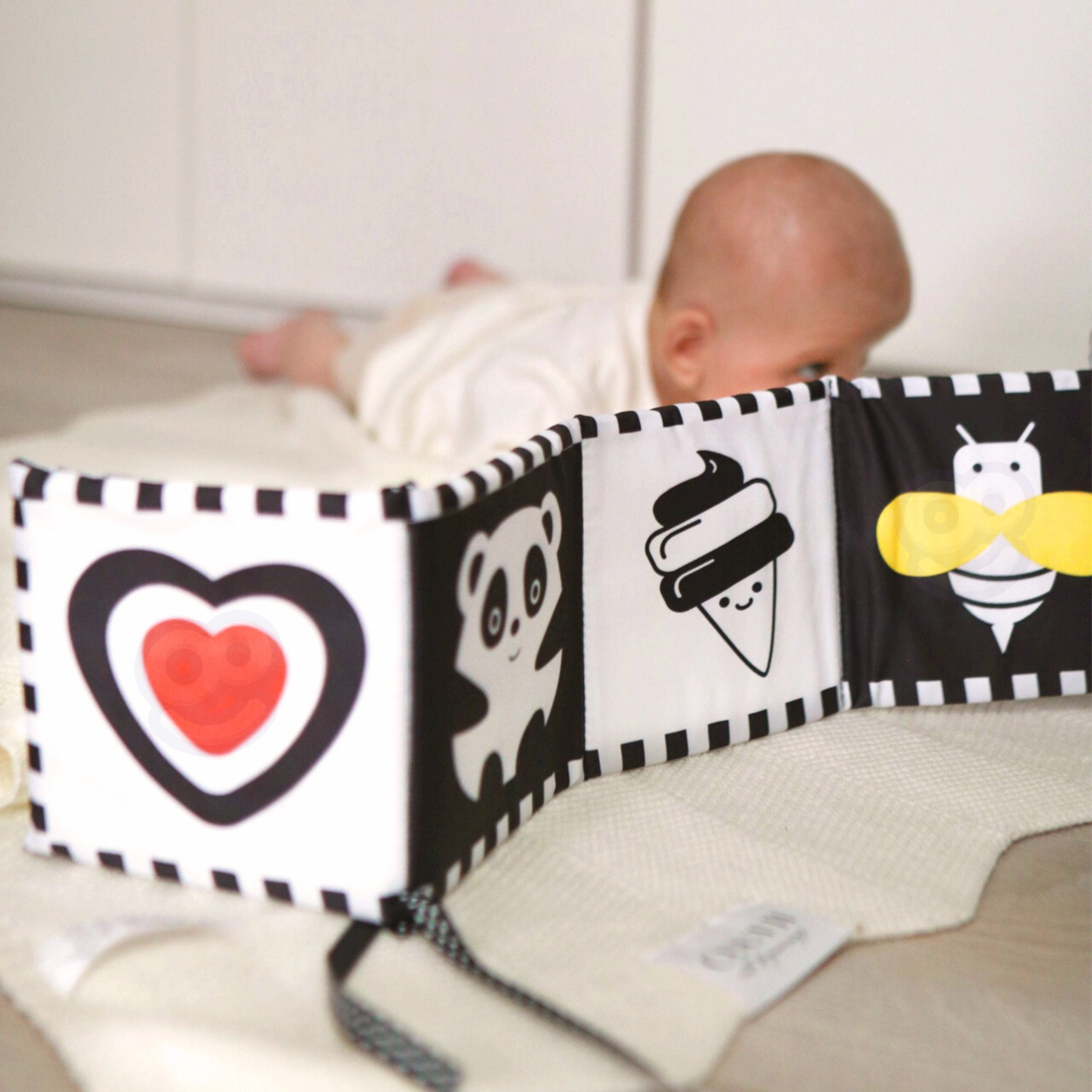 Crno-bijeli uzorci na karticama, knjižici i panelu prirodno privlače pogled novorođenčeta, podupiru prvo fokusiranje i produljuju vrijeme koncentracije tijekom tummy time aktivnosti.