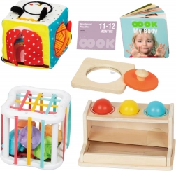 Montessori box 5u1 donosi promišljene aktivnosti za svakodnevno otkrivanje svijeta. Djeca će uživati u elastičnoj senzoričkoj kocki s obojenim blokovima, drvenim kutijama s lopticama za uvježbavanje postojanosti predmeta, ogledalcu koje potiče samosvijest te lako prihvatljivim manipulativnim elementima. Set je osmišljen tako da prirodno jača finu motoriku, pažnju i maštu.