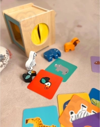 Djeca vježbaju boje, oblike i prepoznavanje životinja uz drvene dijelove i kartice. Igra potiče logiku, koncentraciju i koordinaciju oko–ruka.