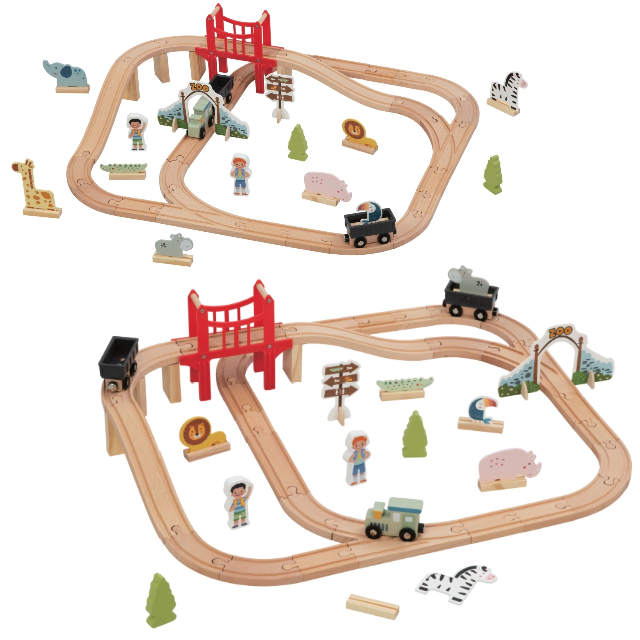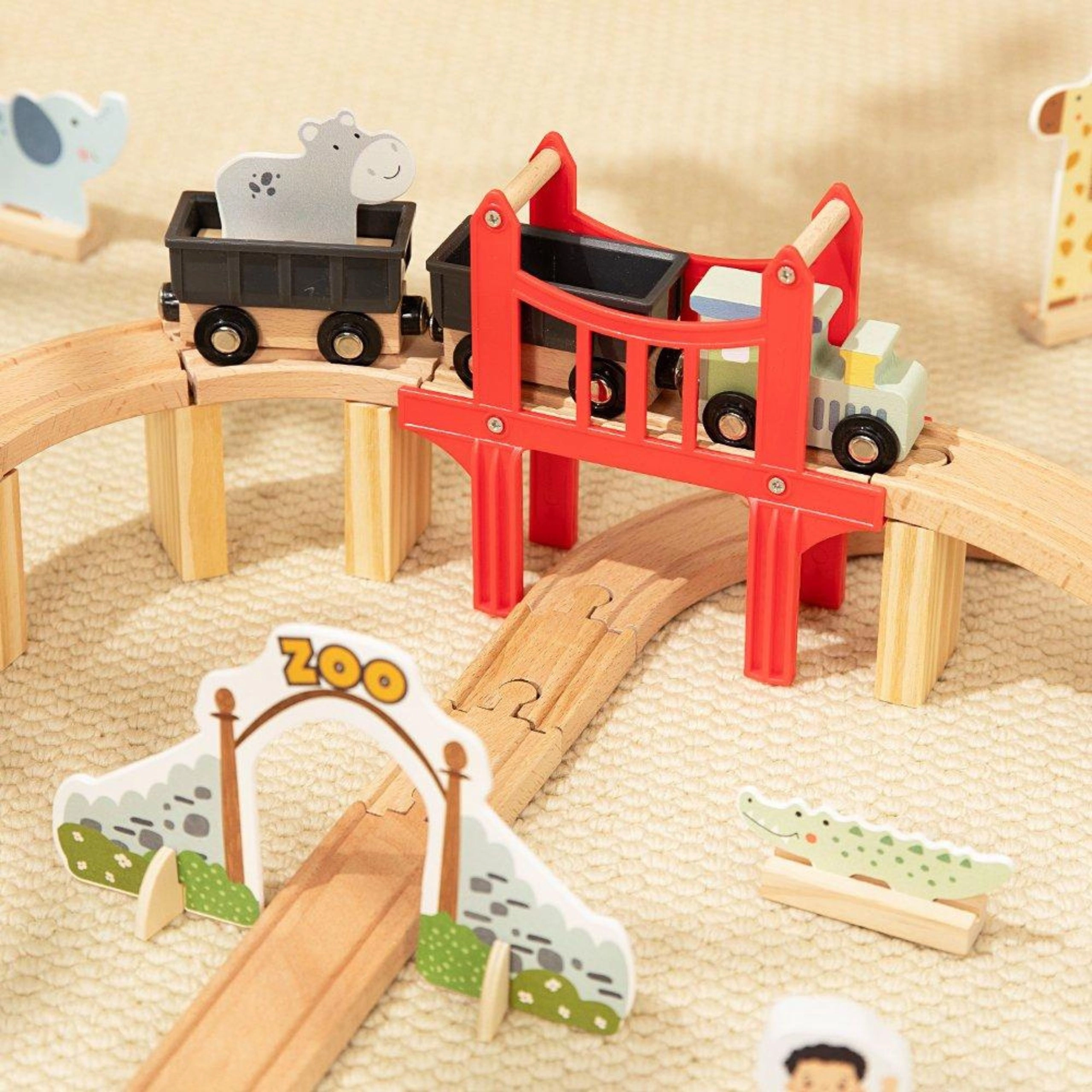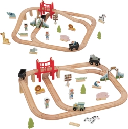 Set je osmišljen za zabavu i razvoj vještina: slaganje tračnica, manipulacija figuricama i planiranje rute potiču kreativnost, koordinaciju oko–ruka i strpljenje. Kvalitetna drvena izrada osigurava izdržljivost i dug vijek trajanja, a set je ujedno kompatibilan s većinom popularnih drvenih željezničkih pruga.