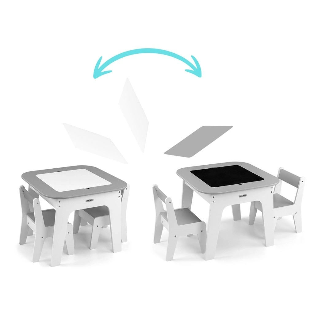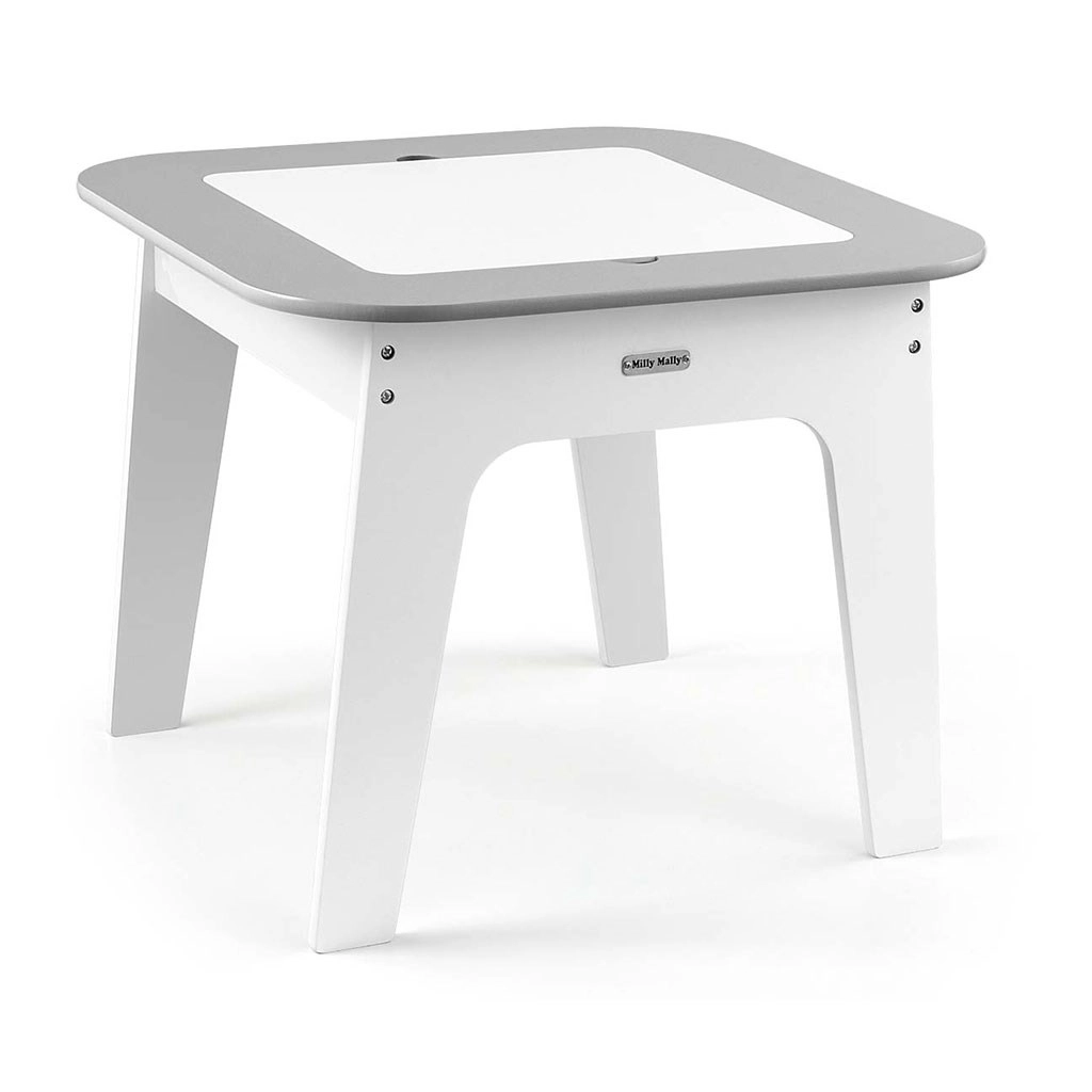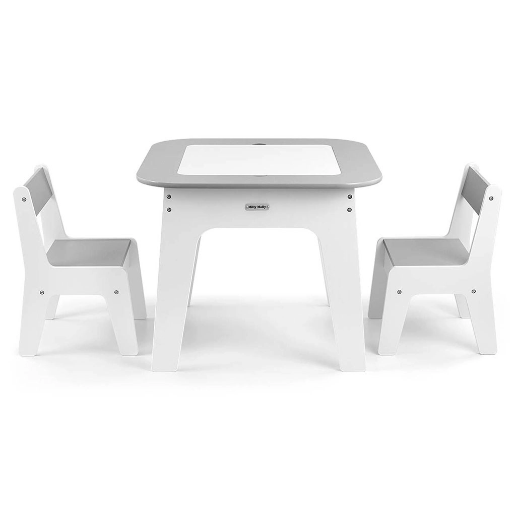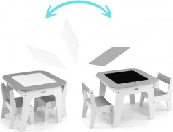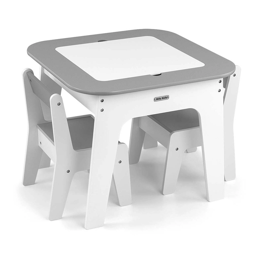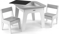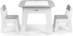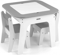 Set Olaf Grey spaja moderan izgled s pametnim funkcijama. Odvojiva obostrana ploča nudi bijelu glatku površinu i ploču za crtanje kredom. Ispod ploče skriven je velik prostor za pohranu koji pomaže održati red u dječjem kutku. Laka, ali stabilna konstrukcija omogućuje djeci lako premještanje stolica.