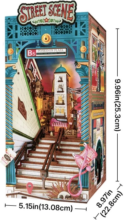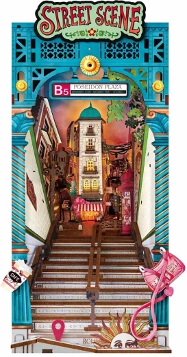 Ovaj DIY set iz serije ROLIFE Book Nook pretvara vašu policu s knjigama u slikovitu gradsku uličicu. Gornji dio scene nudi pogled s razine ulice – ne nedostaju lampe, natpisi, popločanje ni svjetleći prozori. Dolje kod stepenica otkrit ćete male rekvizite gradskog života, poput papirnate čaše za kavu ili ružičaste torbice, a za ljubitelje putovanja tu su i motiv sunca i oznake na karti. Kada ga gurnete na policu, iznenadit će vas pametan element: ispod stepenica skriva se mini kolodvor koji se otkriva pri izvlačenju.