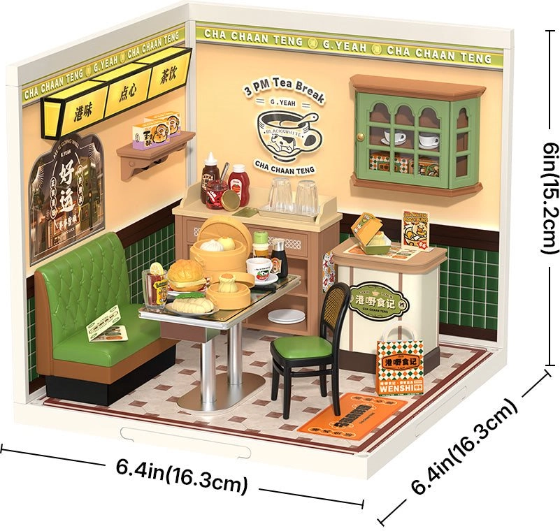 Otkrijte čaroliju tradicionalne hongkonške kavane u minijaturi s modelom Rolife DIY kućica: hongkonška kavana. Set s 114 dijelova i LED osvjetljenjem nudi jednostavno sastavljanje (težina 1/5) za otprilike 1 sat te donosi autentične detalje poput zelene kožne sofe, poslužavnika na kotačima i kultnih poslastica uključujući dimsum, ananase peciva i mliječni čaj.