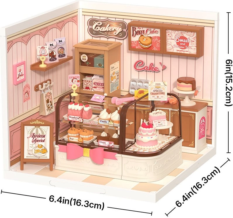 Otkrijte čar minijaturne slastičarnice u kojoj ne nedostaju torte, rolade ni slojeviti deserti koji izgledaju kao da su za zalogaj. U središtu se ističu staklene vitrine i dva pulta – jedan ravan i drugi elegantno zakrivljen – s izloženim cupcakeovima i makaronima s raznobojnim oznakama. Tu su i kliješta za posluživanje te druge slastice skrivene straga, koje upotpunjuju autentičnu atmosferu.