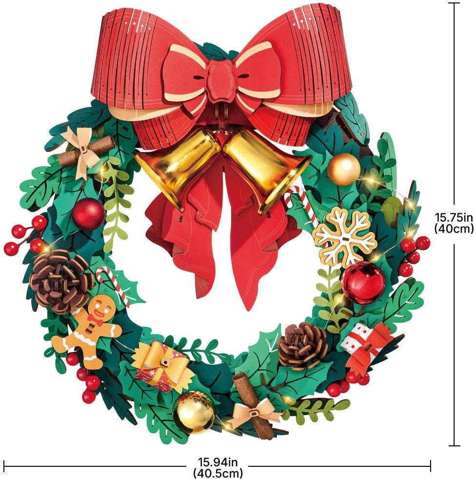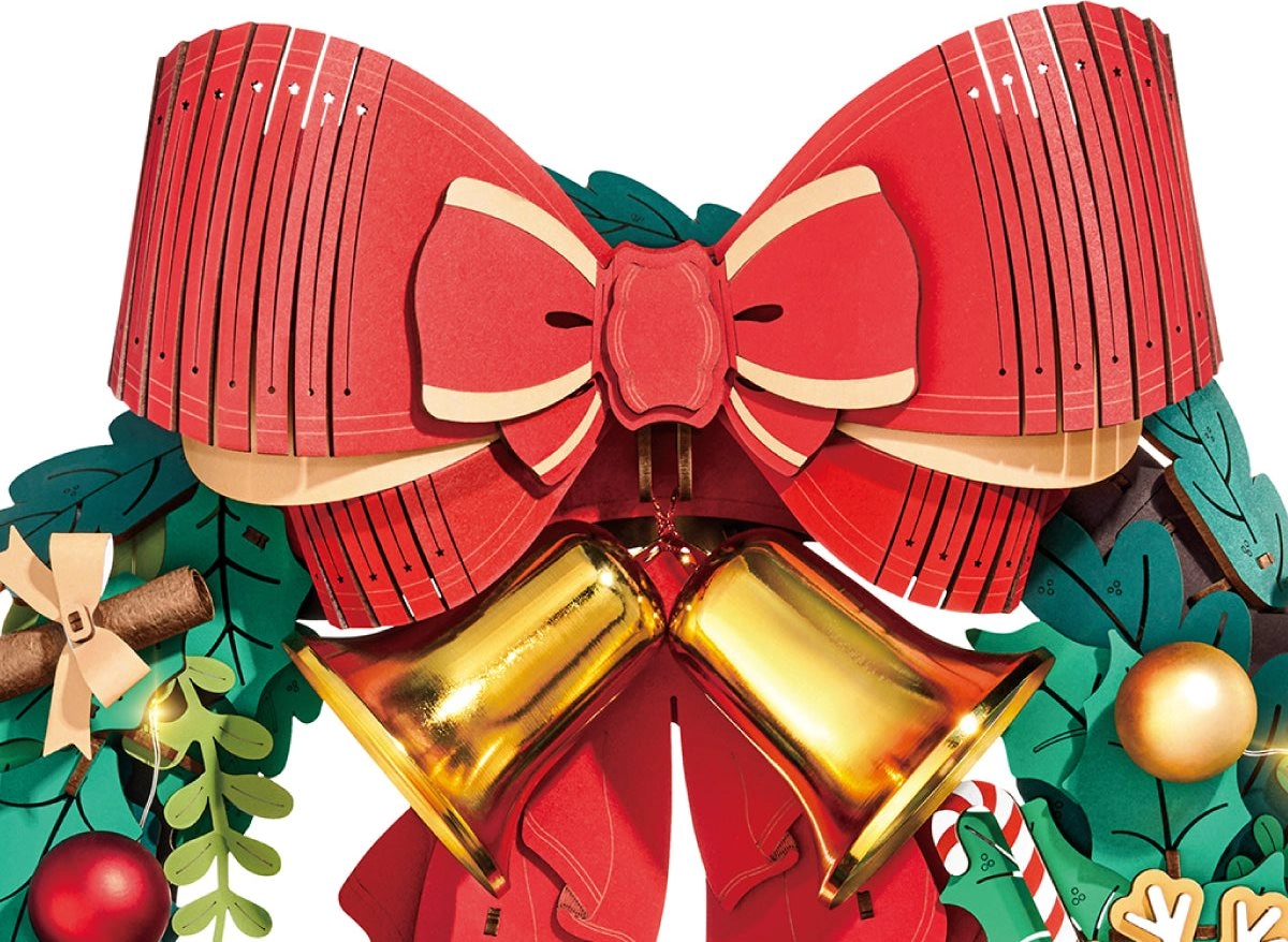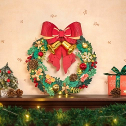 Ovaj elegantni blagdanski vijenac spaja tradicionalne motive i modernu DIY zabavu. Zelene grančice upotpunjuju ukrasi poput božikovine, bobica, češera, snježnih pahulja, medenjaka, poklona i ikonične velike crvene mašne sa zlatnim zvoncima. Integrirane LED diode pojačavaju blagdanski ugođaj i pretvaraju gotov model u jedinstvenu dekoraciju za vrata ili zid.