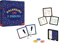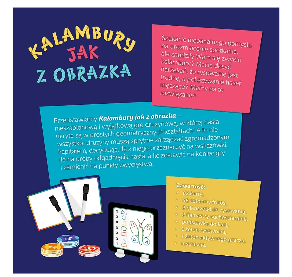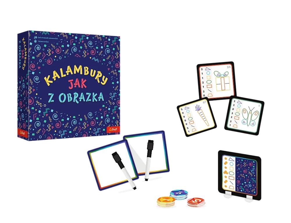 Otkrijte originalnu timsku igru u kojoj su pojmovi skriveni u jednostavnim oblicima. Uz pomoć geometrijskih dijelova stvarate slike i vodite tim do rješenja. Kreativnost, strategija i zabava za cijelu obitelj – to je Kalamburi: kao sa slike od Trefl.