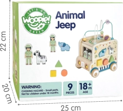 Otkrijte razigrani svijet s drvenom aktivnom kockom u obliku safari auta brenda WOOPIE GREEN. Ova multifunkcionalna igračka kombinira motorčki labirint, razvrstavanje oblika, okretna zupčanika i slikovne blokove kako bi potaknula finu motoriku, koordinaciju i kreativnu igru djece od 18 mjeseci.