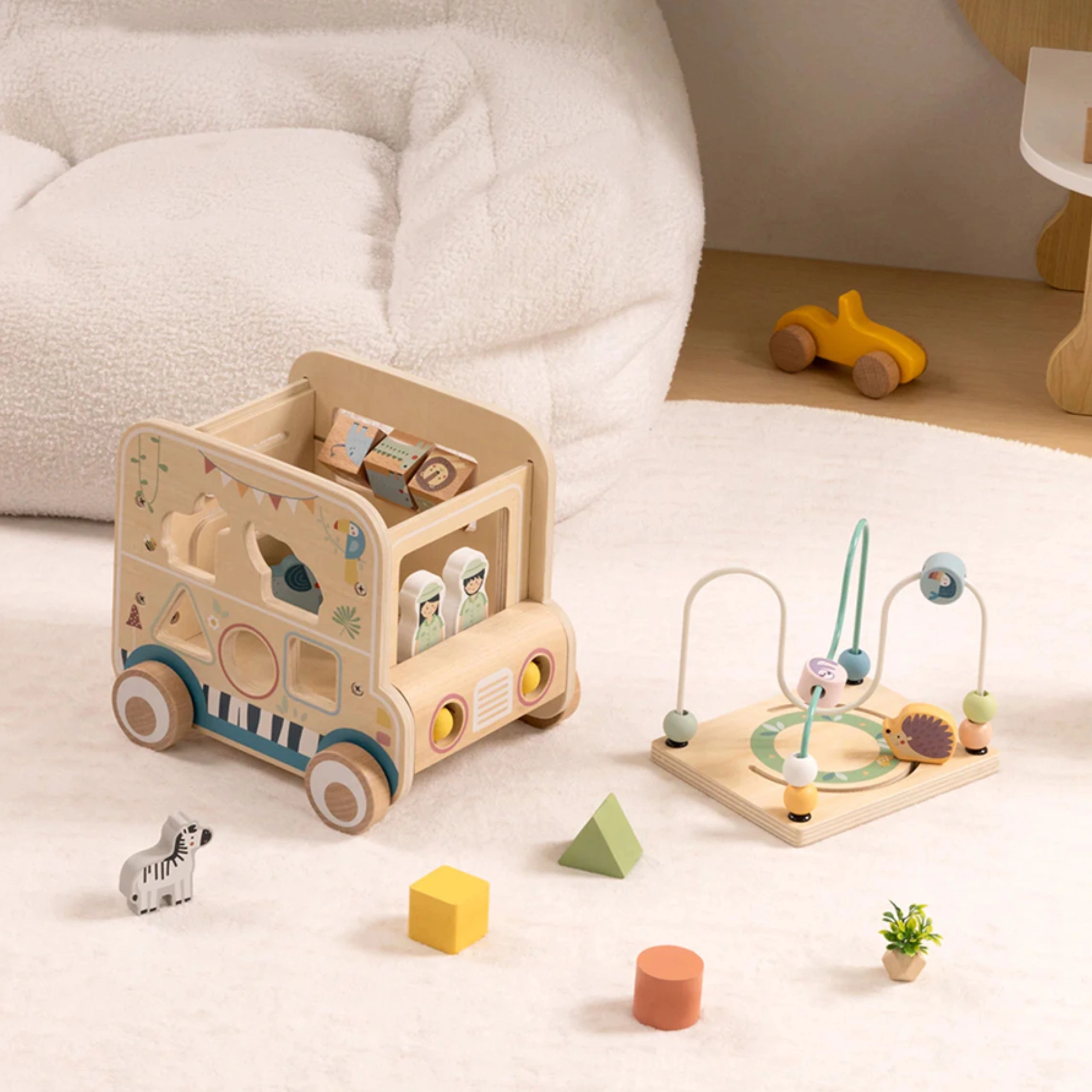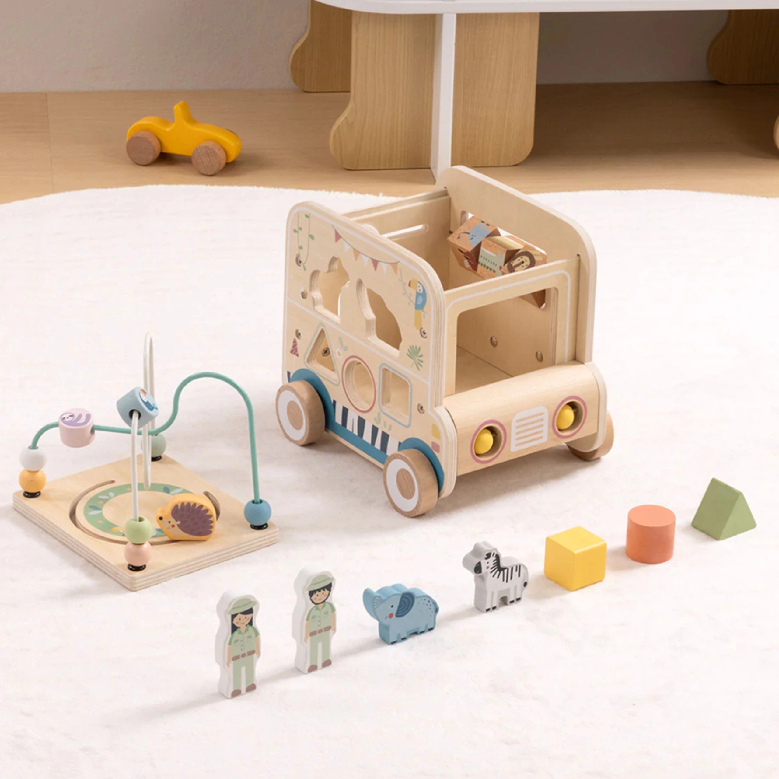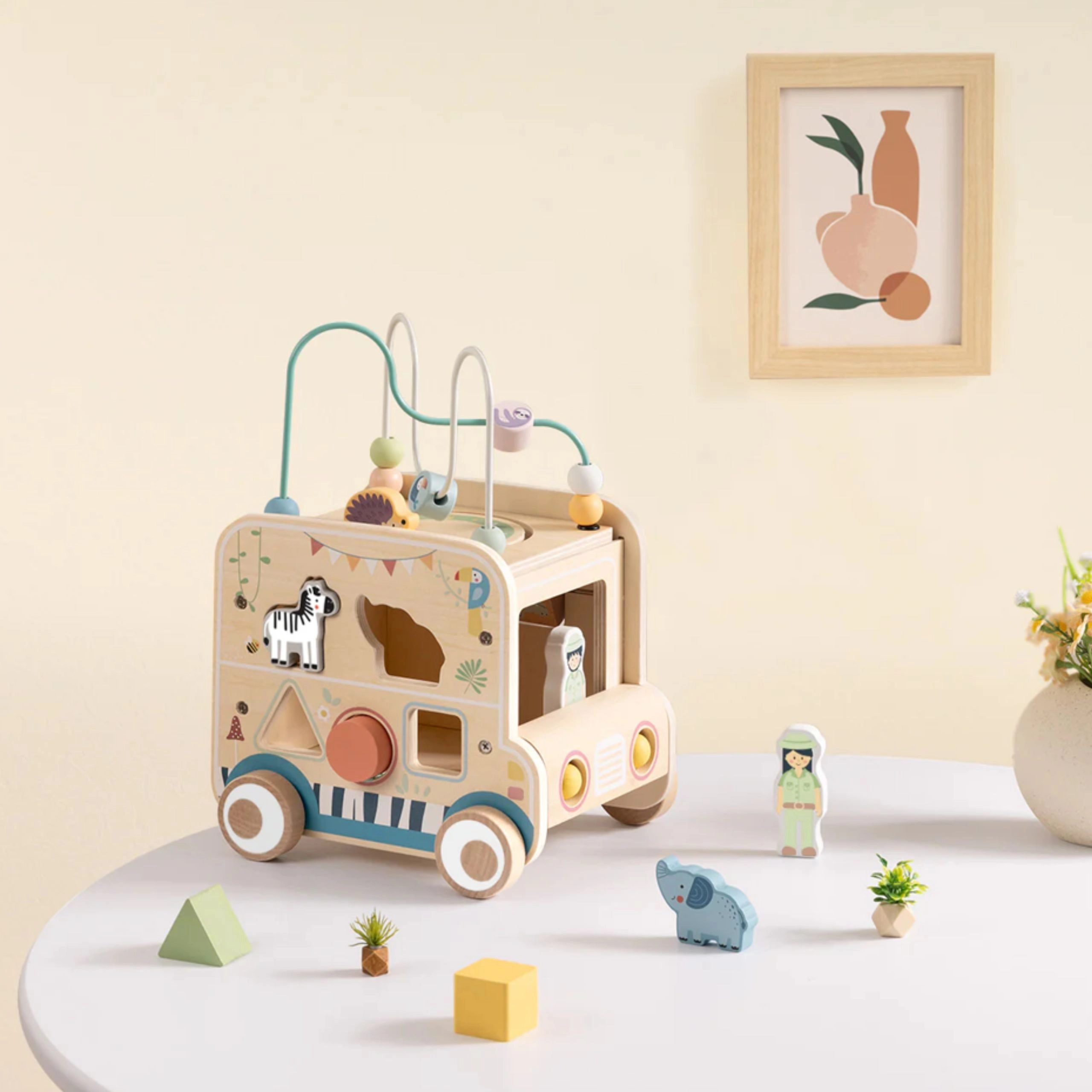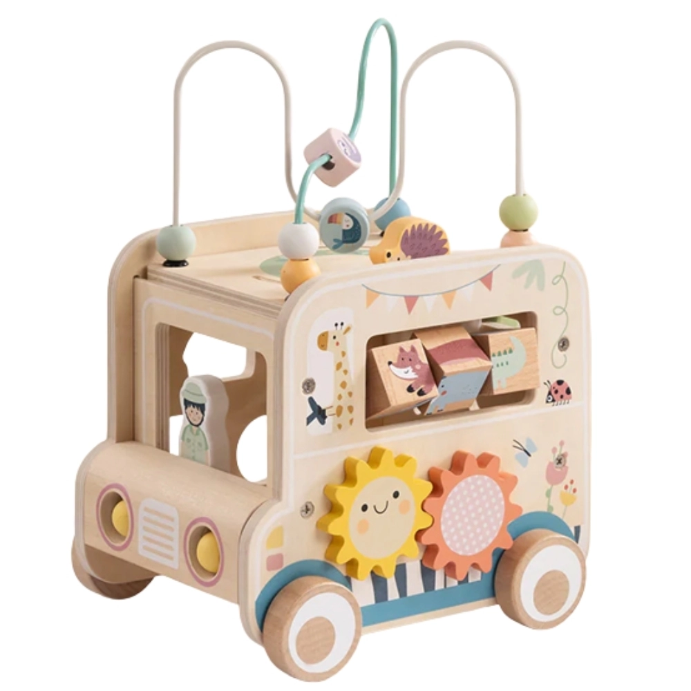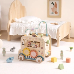Drvena aktivna kocka/safari auto donosi djeci bezbroj mogućnosti otkrivanja. Od odvojive motorčke petlje s perlicama preko labirinta i zupčanika do okretnih blokova sa životinjama – svaka strana nudi novi izazov. Dizajn u nježnim bojama i glatka izrada podupiru sigurnu igru i razvoj vještina.