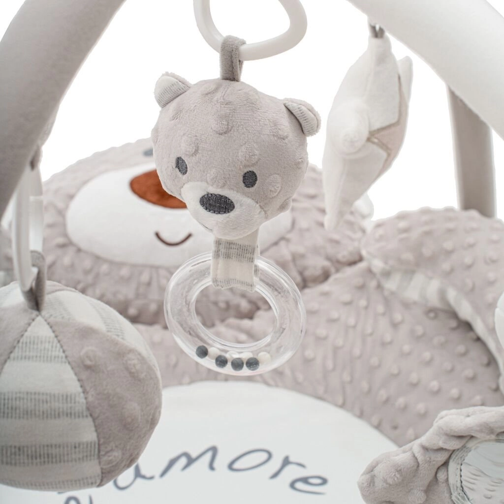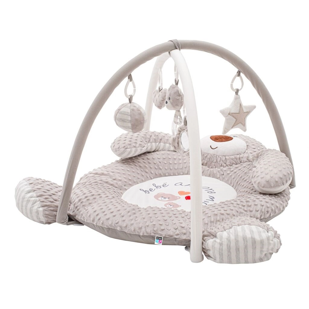 Ova luksuzna igraća podloga od fine tkanine minky s ispupčenjima stvara ugodno i sigurno okruženje za vašu bebu. Kontrastni uzorci, raznolike teksture i interaktivni elementi podupiru razvoj vida, dodira, koordinacije i fine motorike. Integrirana hrazdica s odvojivim igračkama motivira dijete na pružanje ručica, hvatanje i okretanje.