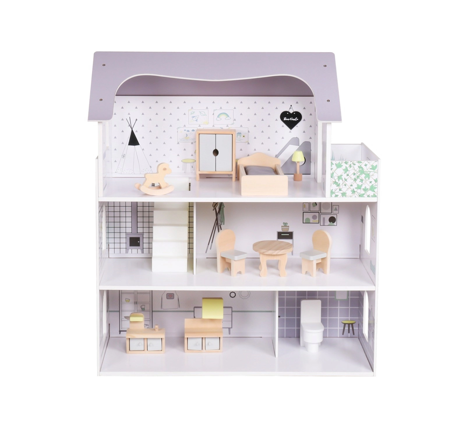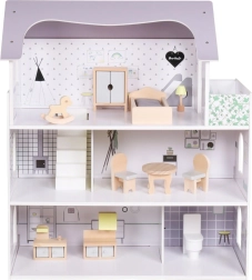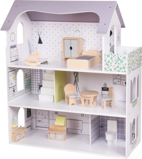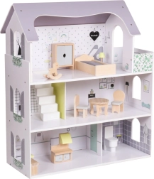 Ova stilska kućica za lutke postat će središte dječje sobe. Tri prostrana kata s printanim zidovima i lučnim prozorima nude mnogo mjesta za maštovite prizore, premještanje namještaja i svakodnevne priče. Otvorena prednja strana omogućuje udobnu igru s više strana.