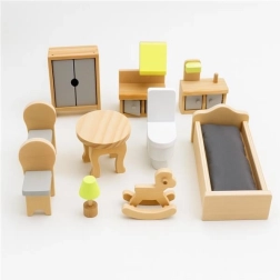 Dio pakiranja je 10 komada namještaja (krevet, stol, stolice, kuhinjski elementi, ormarić, WC itd.) koje se može slobodno rasporediti. Kvalitetna konstrukcija od MDF-a i punog drva stabilna je, izdržljiva i sigurna za svakodnevnu upotrebu. Nježna paleta pastelnih tonova uklopit će se u svaki interijer.
