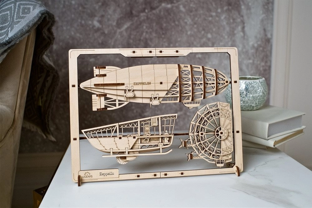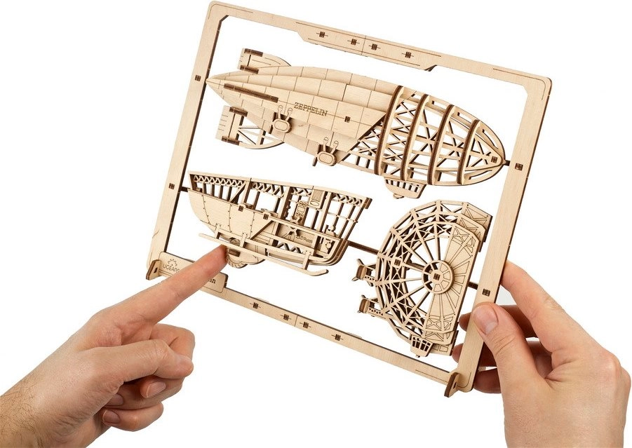 Drvene 3D puzzle UGEARS Zeppelin 2,5D spajaju tradicionalni materijal s mehaničkim pokretom. Sastavljanje je intuitivno i zabavno – dijelovi su laserom precizno izrezani i lako se izlamaju iz ploča, pa za kompletiranje nije potrebno nikakvo ljepilo. Nakon sastavljanja dobit ćete detaljan model zračnog broda s gondolom i propelerom, koji postaje originalna dekoracija i edukativno pomagalo.
