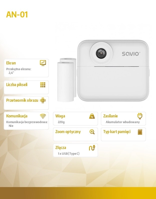 Otkrijte zabavu fotografiranja s dječjim instant fotoaparatom SAVIO AN‑101. Zahvaljujući trenutačnom crno-bijelom ispisu bez tinte, 48 MP senzoru, 2,4" zaslonu u boji i selfie načinu, djeca će lako zabilježiti svoje doživljaje i odmah ih podijeliti. Ugrađene igre, baterija 1200 mAh do 6 sati i punjenje preko USB‑C čine AN‑101 savršenim pratiteljem za dom, odmor i obiteljska događanja.