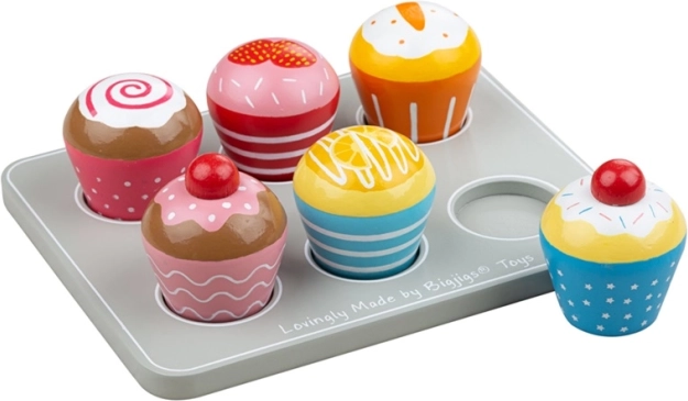 Šest veselih drvenih muffina na poslužavniku za igru u kuhinjici, dućanu ili na čajanki. Svaki muffin je šareno ukrašen, lako se umeće u drveni stalak i potiče dječju maštu, finu motoriku i socijalne vještine. Izrađeno od kvalitetnog, odgovorno dobivenog drva i u skladu s važećim europskim sigurnosnim normama.