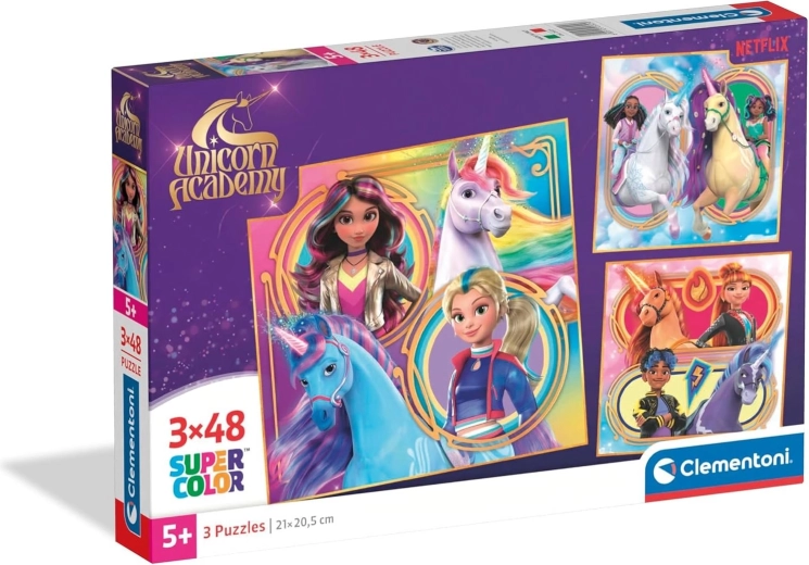 Očaravajuća dječja slagalica s motivom Jednorog akademije razveselit će svakog malog ljubitelja bajki. Pakiranje sadrži 3 slagalice po 48 dijelova, svaka nakon slaganja mjeri približno 21 × 20,5 cm. Kvalitetan tisak, žive boje i čvrsti dijelovi potiču strpljenje, koncentraciju i motoriku.