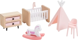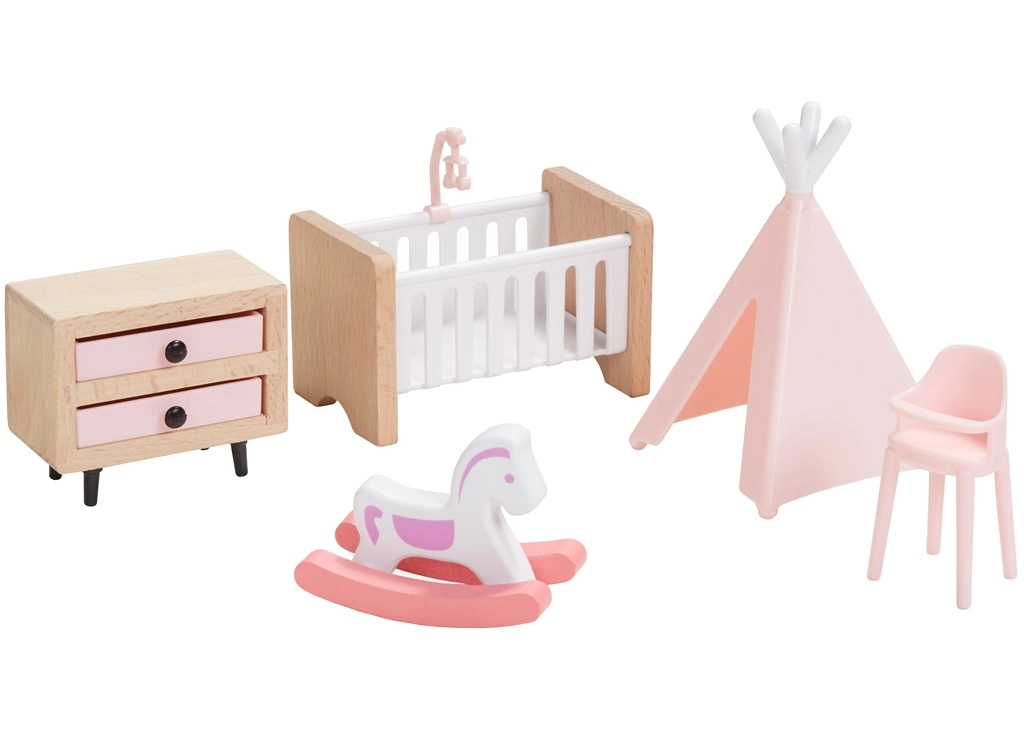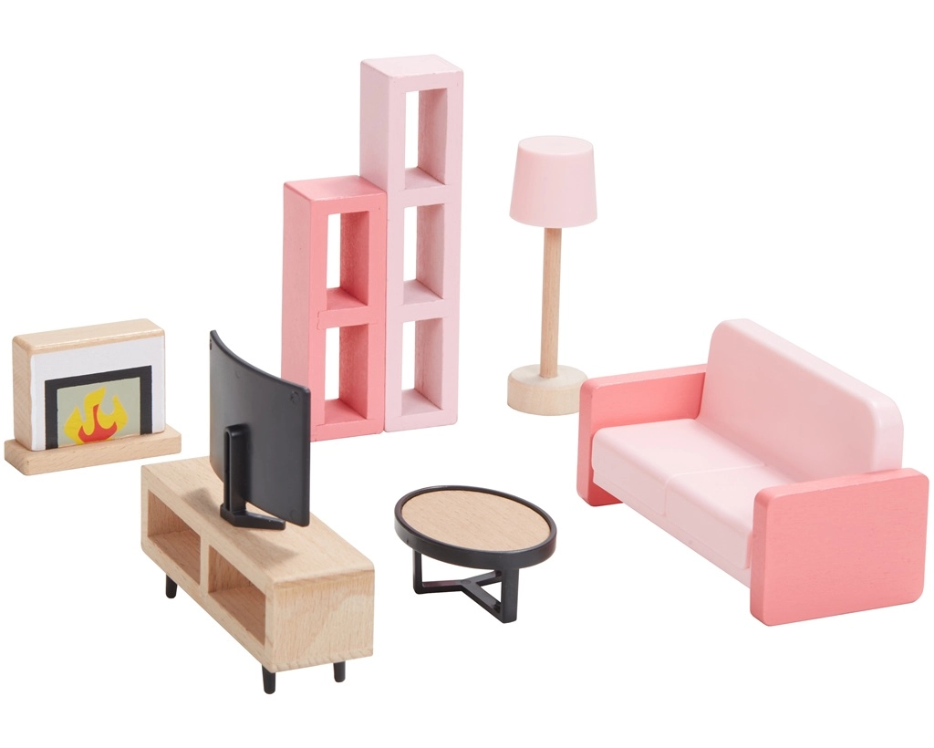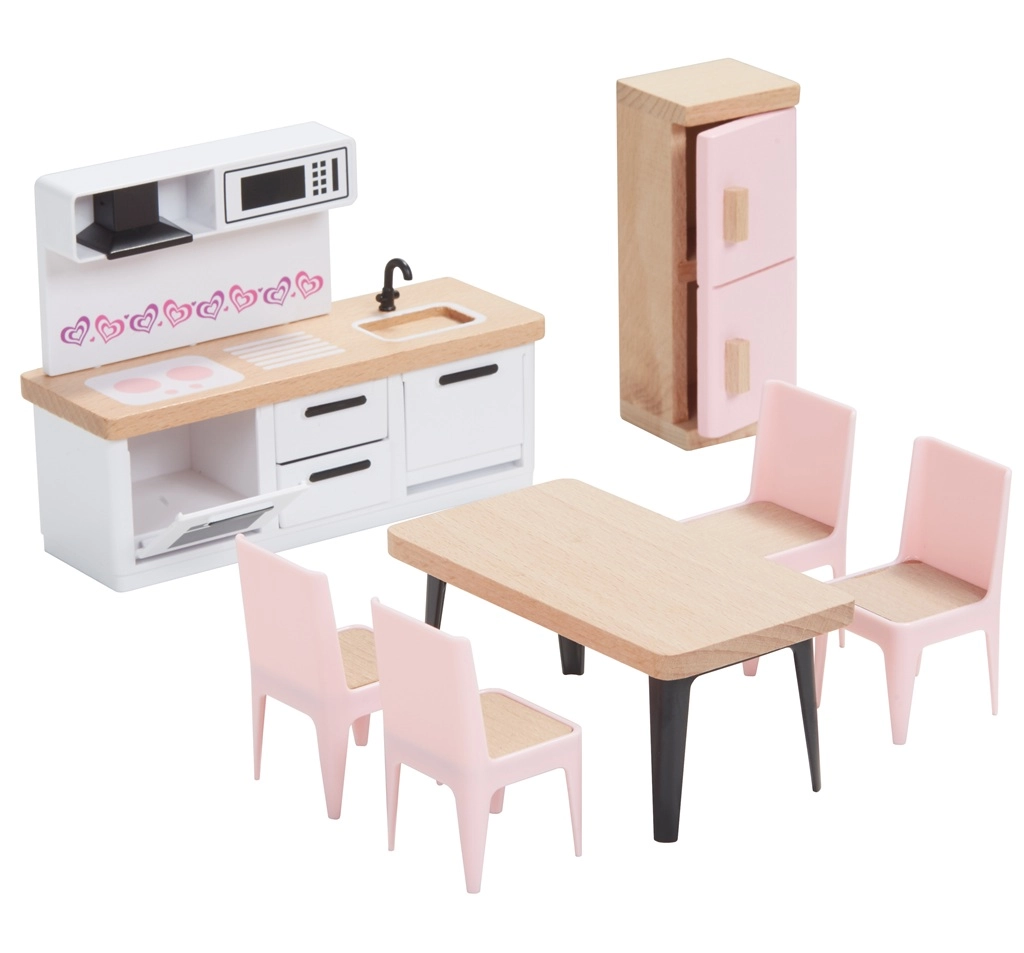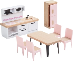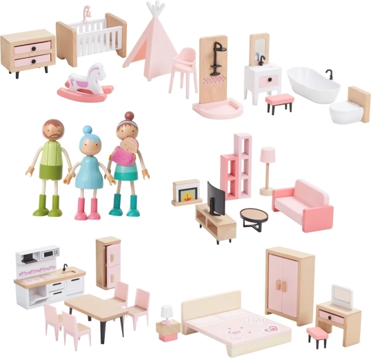 Ovaj univerzalni set namještaja za kućicu nudi sve što djeci treba za stvaranje ugodnog doma za njihove figurice. U njemu se nalazi oprema za spavaću sobu, kuhinju, dnevni boravak, kupaonicu i dječju sobu u skladnoj kombinaciji prirodnog drva i nježnih ružičastih akcenata. Ne nedostaje ni cijela obitelj s pomičnim udovima za autentične scene i igru uloga.