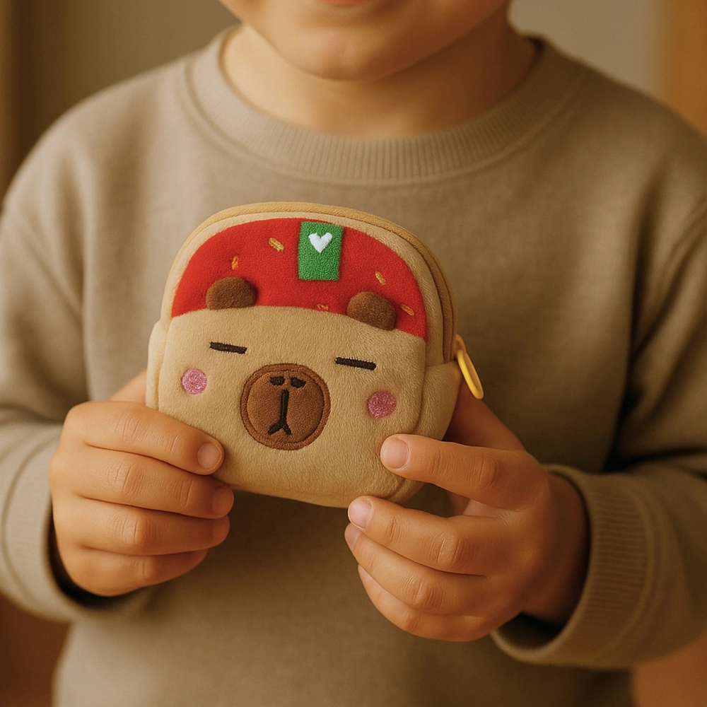 Ovaj mekani plišani novčanik s motivom kapibare i crvenom jagodnom kapicom oduševit će svojim slatkim dizajnom i ugodnim materijalom. Zahvaljujući patentnom zatvaraču vaše će sitnice ostati na sigurnom, a kopča omogućuje da novčanik uvijek imate pri ruci – na ruksaku, torbi ili petlji hlača.