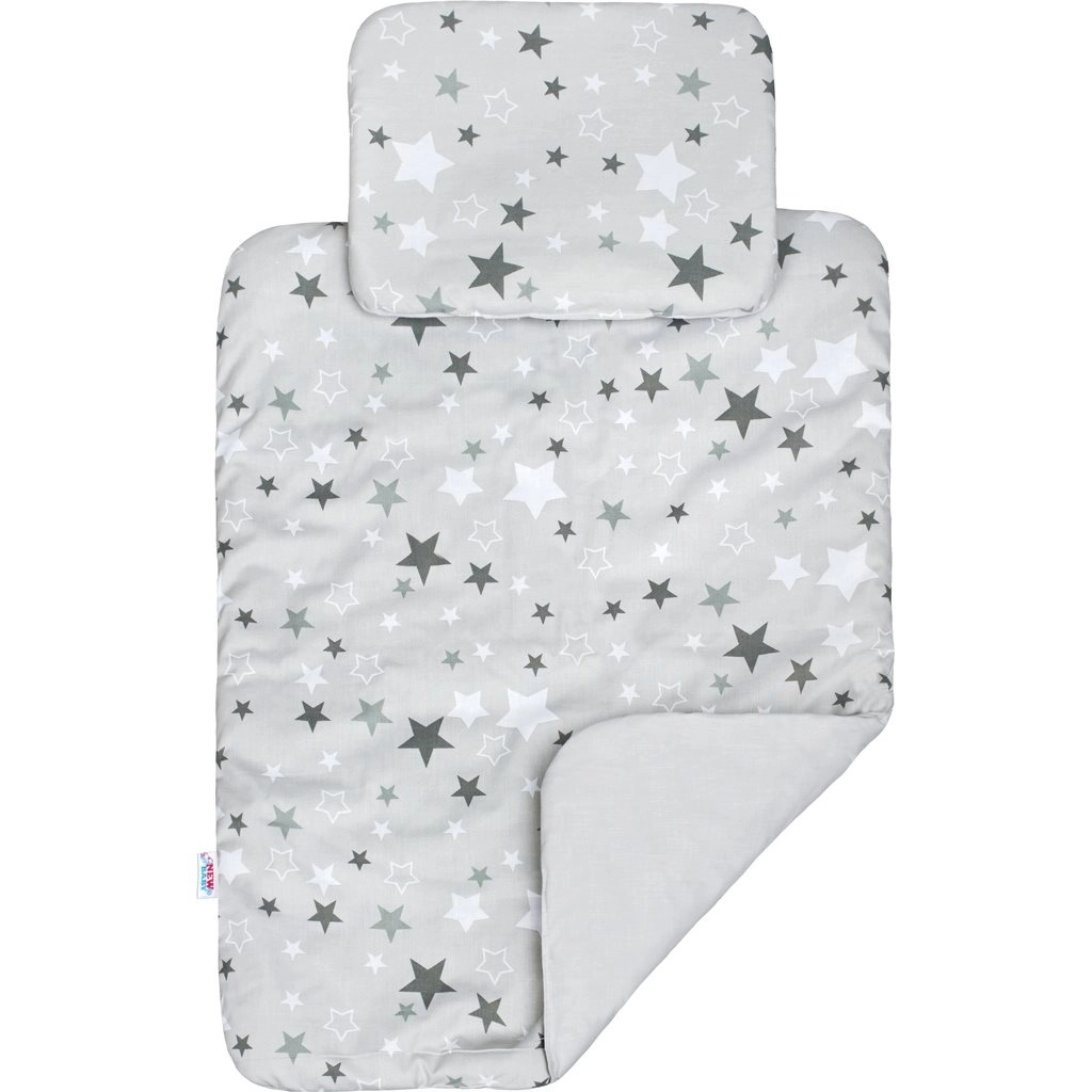 Gornji materijal od 100% pamuka nježan je prema osjetljivoj koži, dok punjenje od antialergijskih vlakana osigurava potrebnu potporu i prozračnost. Dio seta su usklađeni popluni koje možete koristiti i zasebno u kolicima ili krevetiću.
