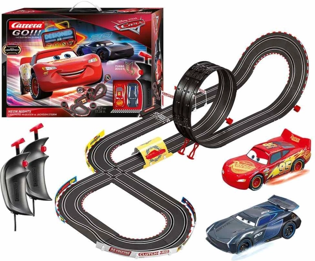 Autostaza CARRERA GO!!! Cars Neon Nights nudi akcijske utrke u mjerilu 1:43 s dva licencirana autića Lightning McQueen i Jackson Storm. Zahvaljujući turbo gumbu na upravljačima doživjet ćete munjevita ubrzanja, dok će looping, suženje i raskrižje provjeriti vaše vozačke vještine. Jedinstveni click sustav omogućuje brzo sastavljanje i rastavljanje staze.